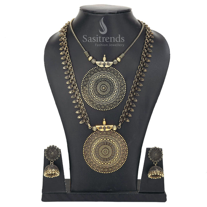 - Product Description: Delight in the artistry of the Oxidised Niranjana Combo Jewellery Set, an exquisite pairing of the stately Long Haram and the graceful Short Pendant Necklace, complemented by the iconic Nayanthara Jhumka Earrings. The Long Haram is a cascade of finely crafted leaf motifs, culminating in an ornate, mandala-inspired pendant, a hallmark of traditional craftsmanship. The Short Pendant Necklace mirrors this design but with a closer embrace around the neck, on a delicate cord that highlights the pendant's intricate embossing. The Nayanthara Jhumka Earrings, with their elegant dome shape and beaded accents, complete the set, making it a versatile choice for both grand celebrations and intimate gatherings. Each piece, in both the Oxidised Silver and Antique Gold finishes, speaks of a storied past reimagined for today's fashion-forward individual.