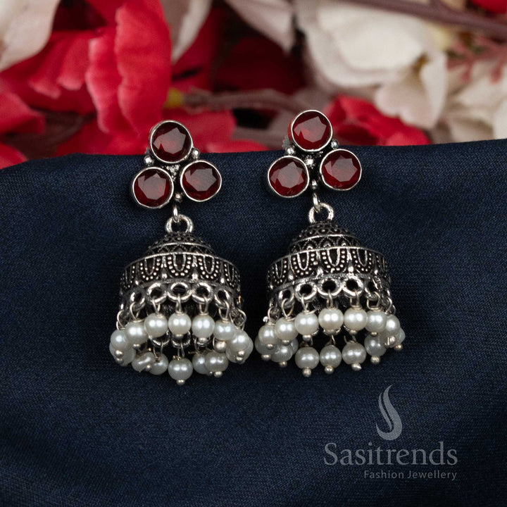 - Description: Elevate your ethnic ensemble with Sasitrends’ Oxidised Pearl Bead Cluster Jhumka Earrings, a captivating fusion of vintage charm and modern grace. These statement jhumkas feature a tiered triple-stone stud top that exudes sparkle and draws attention with its intricately crafted round-cut stones, making it the perfect choice for festive occasions or elegant evening outings.The dome-shaped jhumka portion is richly detailed with oxidised silver artistry. Intricate patterns in antique finish give a timeless look to the earrings, while the structured bell shape ensures graceful movement with every step. The base is adorned with clusters of tiny pearls, creating a dramatic yet delicate finish that sways gracefully and reflects aesthetics.These earrings combine craftsmanship with contemporary design sensibilities. The rich oxidised finish enhances the depth and dimension of the metalwork, giving a heritage appeal. Perfect for pairing with sarees, lehengas, or Indo-western outfits, these earrings add a statement flourish to your jewellery collection.Whether you're dressing up for a wedding, a festival, or an elegant dinner, these earrings ensure you shine effortlessly. The secure push-back closure offers comfort and confidence for all-day wear, while the build ensures no compromise on ease and style.Let Sasitrends bring you heritage-inspired elegance. Add this pair to your collection for a timeless accessory that bridges with trend.