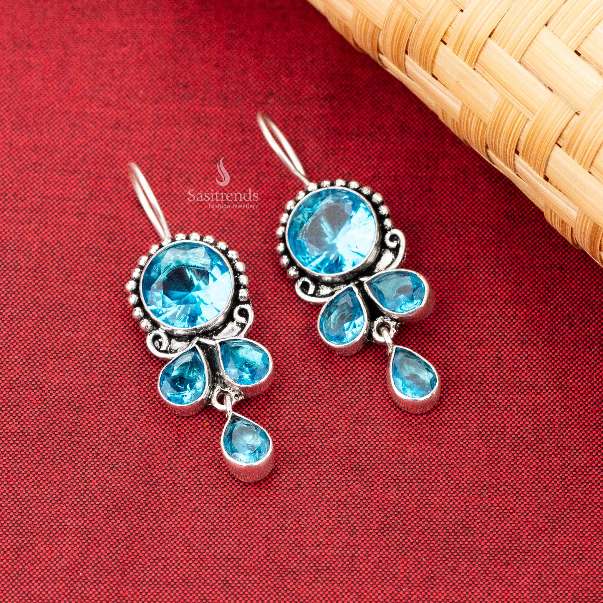 - Product Description: These exquisite oxidised silver drop earrings feature a bold central round stone encircled by intricate detailing. The design is enhanced with dual pear-shaped stone dangles, each adding a pop of vibrant colour. Perfect for those who adore statement pieces with a touch of elegance, these earrings are crafted with precision to match various outfits, from casual to formal occasions. Available in multiple colours, each pair promises to be a versatile addition to your jewellery collection.