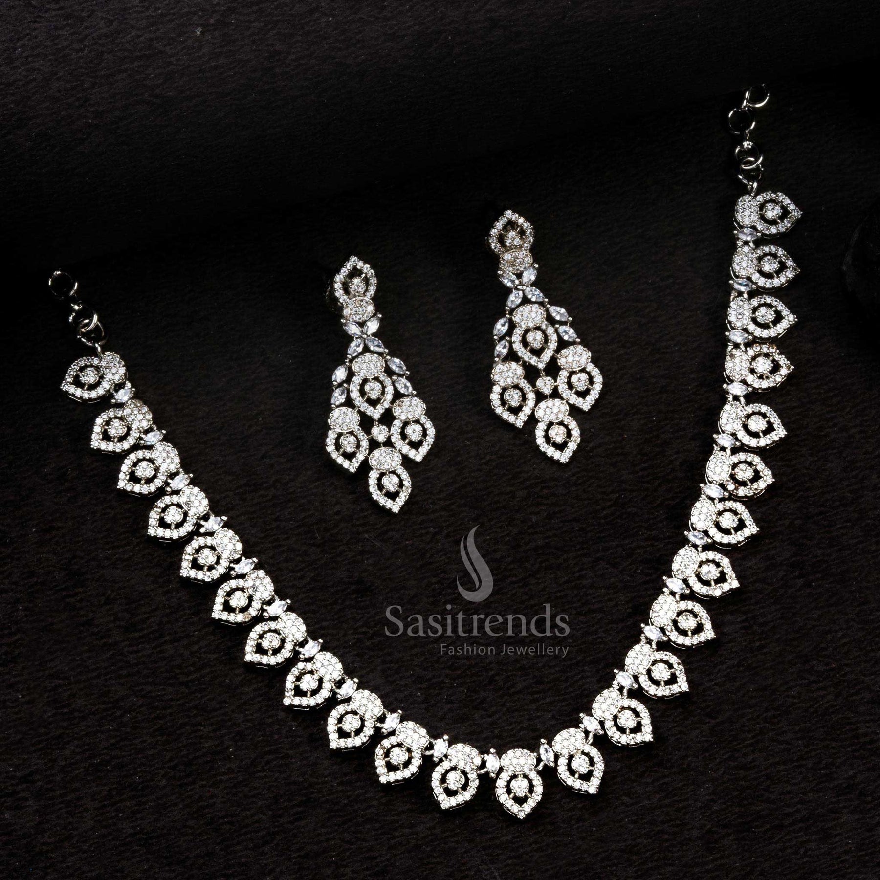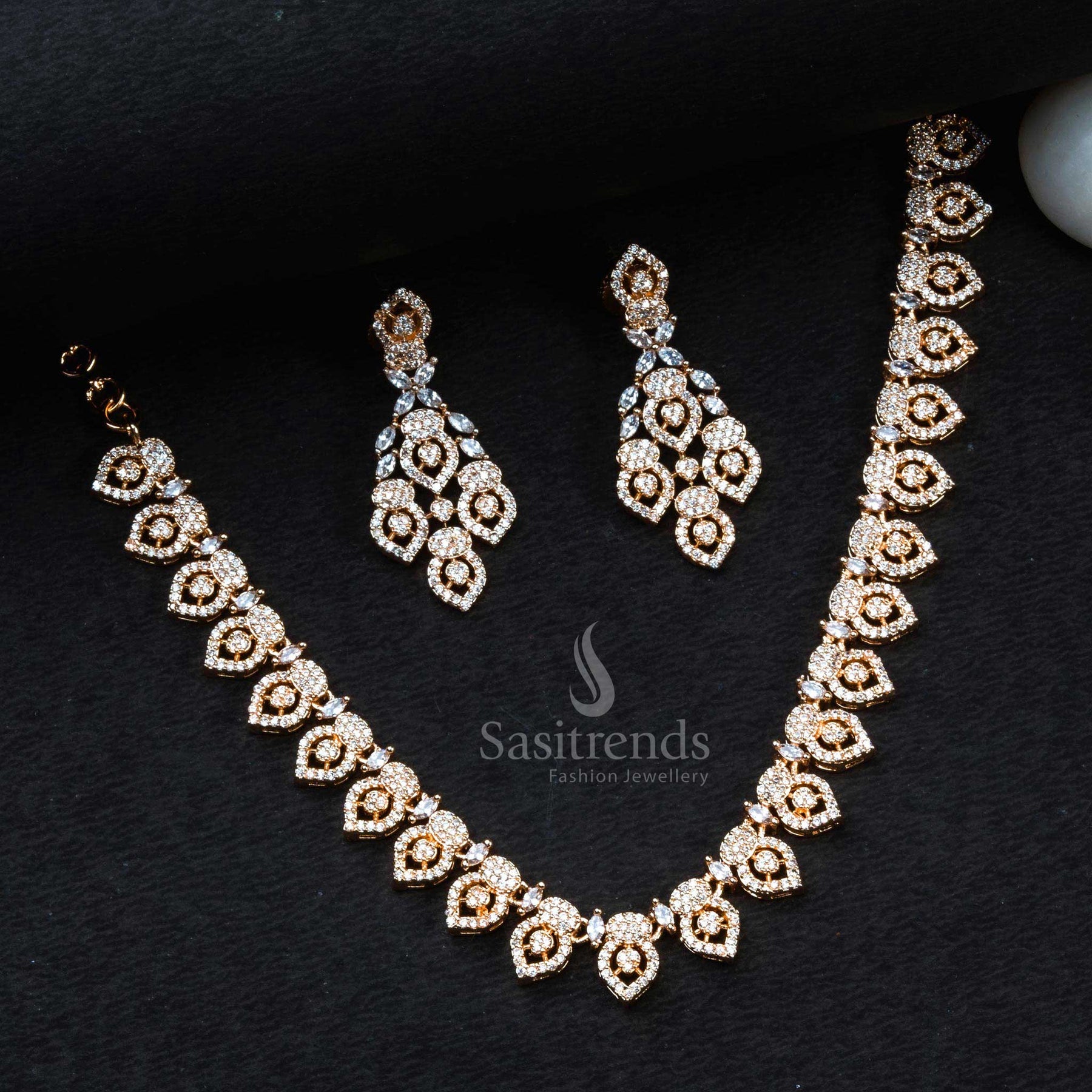Latest Rhodium Silver and Rose Gold Plated Floral Party Wear Necklace Jewellery Set with American Diamond Stones