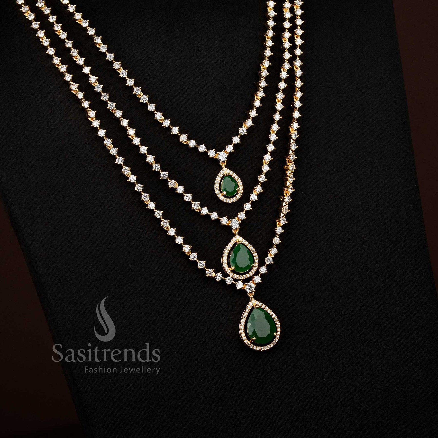 Exquisite white-green American diamond three-tier teardrop stone necklace jewellery set with micro gold finish exuding classic charm – Sasitrends