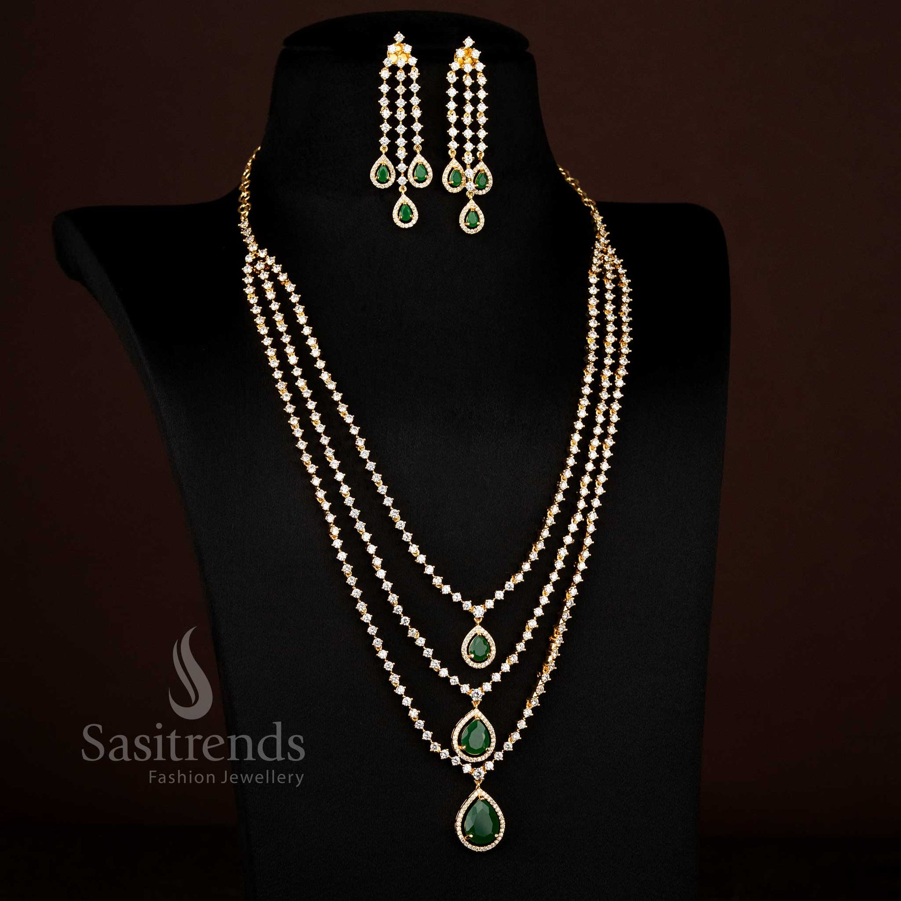 Majestic white-ruby American diamond micro gold plated three layer teardrop stone long necklace jewellery set radiating festive elegance – Sasitrends