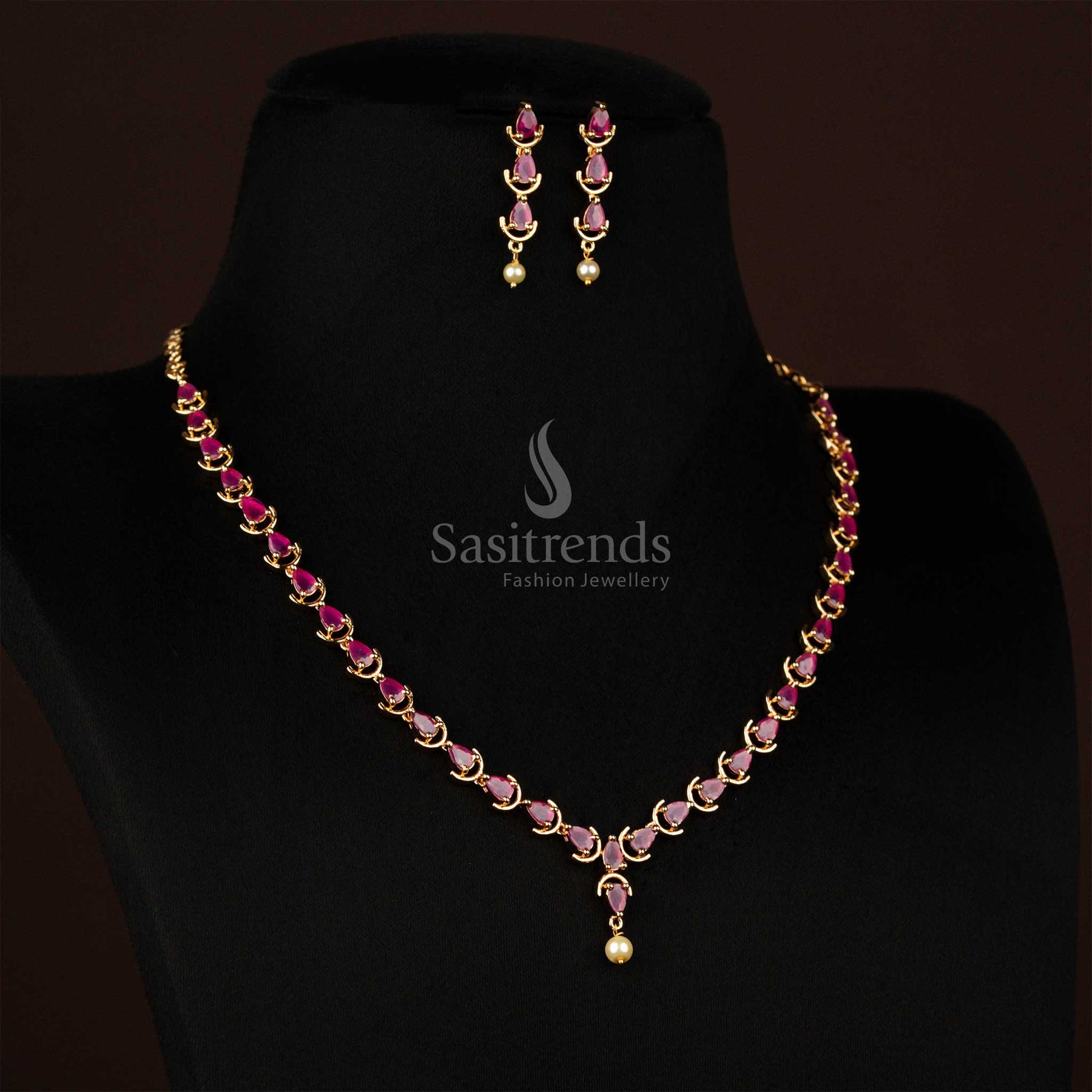Guaranteed Micro Gold Plated American Diamond Ruby Stone with Pearl Necklace Jewellery Set