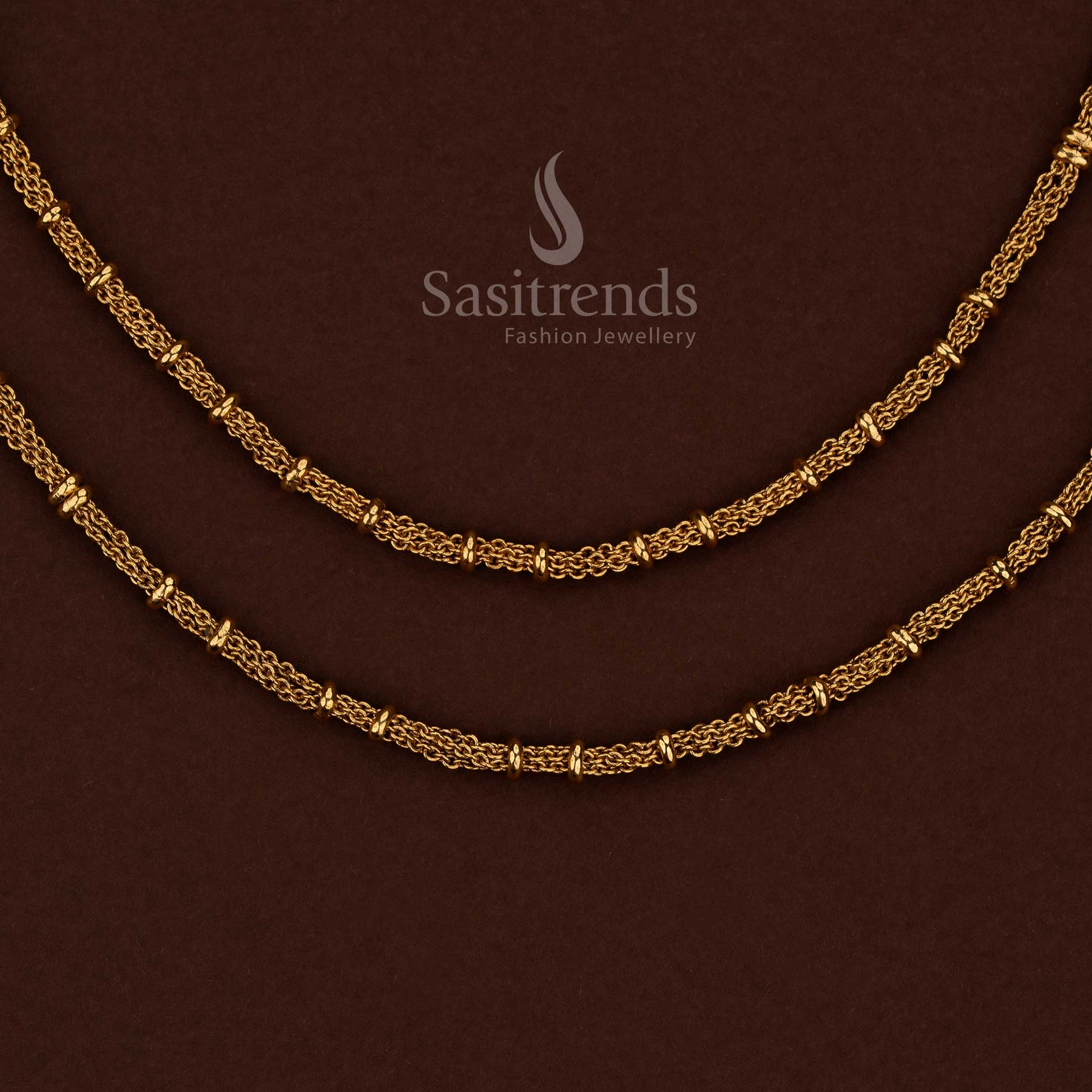 Description: These Matte Gold Plated Temple Strand Interlaced Hoop Anklets are a striking example of traditional South Indian craftsmanship blended with modern elegance. Each anklet features intricately interlaced hoops that form a continuous strand, creating a rhythmic, harmonious design reminiscent of temple architecture and sacred motifs. The matte gold finish enhances the detailed pattern, giving the anklets a rich, understated glow that complements festive and traditional attire.Crafted to ensure comfort and flexibility, the anklets sit gracefully around the ankle without feeling heavy, making them suitable for prolonged wear during religious ceremonies, cultural events, or family celebrations. The interlaced hoop design produces a subtle jingle with movement, adding an enchanting auditory element that enhances the festive spirit.Perfect for temple visits, pooja ceremonies, classical dance performances, festive occasions, and traditional family gatherings, these anklets pair beautifully with silk sarees, lehengas, ethnic skirts, or traditional South Indian outfits. The lightweight yet visually striking design ensures they remain comfortable while elevating the overall ensemble with elegance.A sophisticated accessory for women who appreciate heritage-inspired temple jewellery, detailed workmanship, and timeless design. These anklets bring a graceful finishing touch to ethnic attire while highlighting intricate craftsmanship and cultural symbolism.