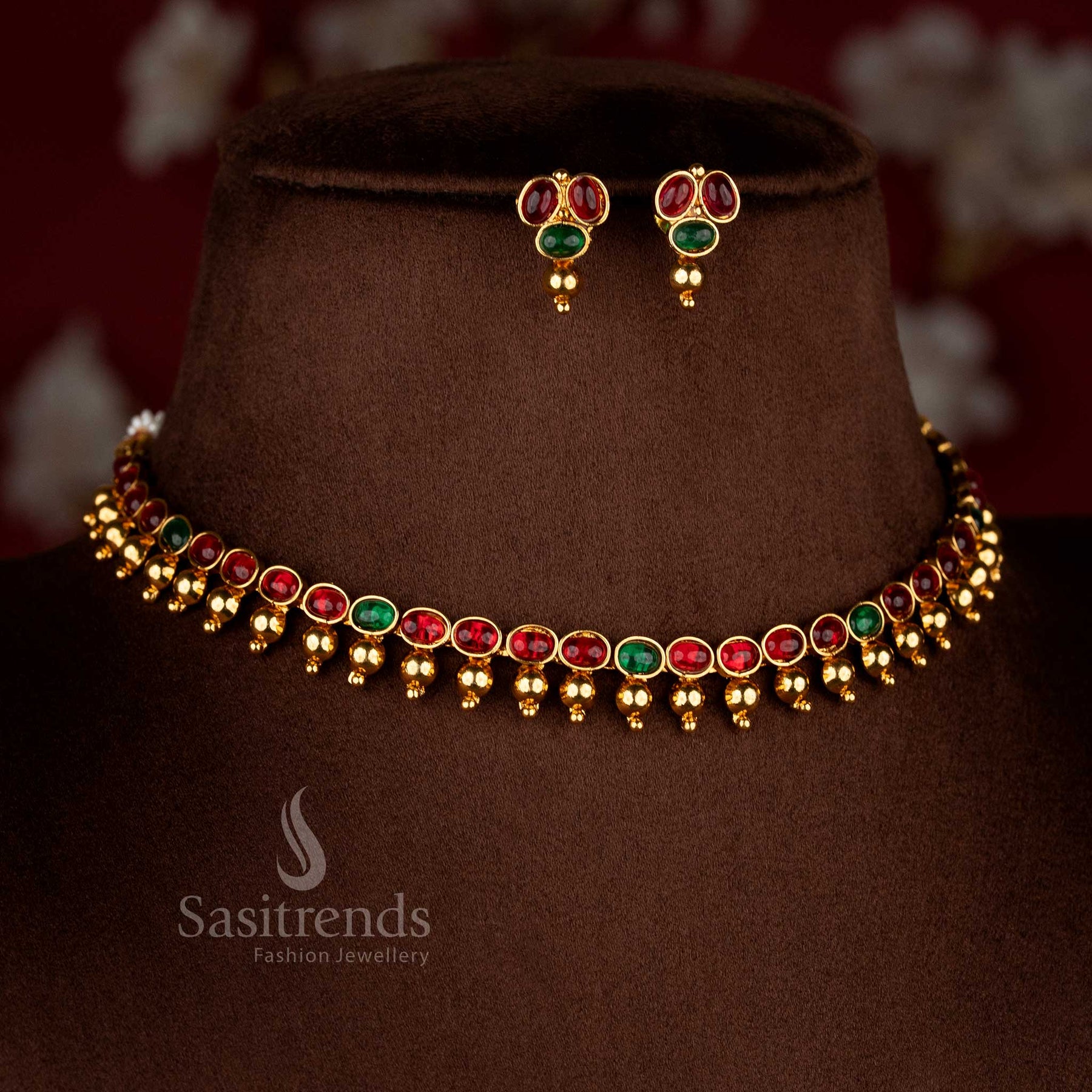 Opulent classic antique Mullapoo jasmine bud red-green stone golden balls temple necklace for festive charm – Sasitrends