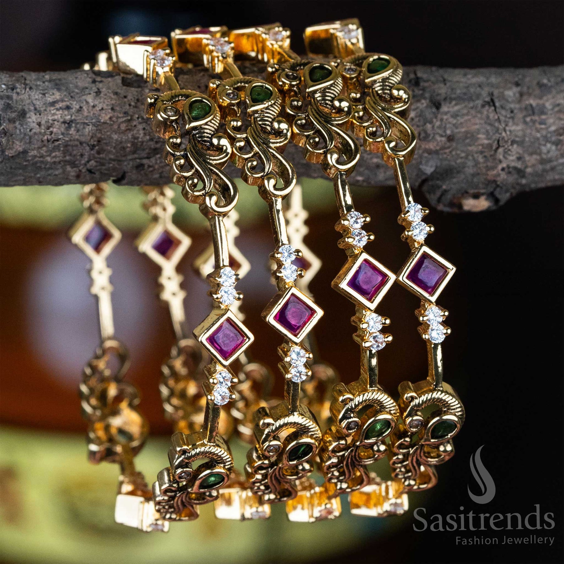 - Product Description: These magnificent Matt Gold Plated American Diamond Peacock Designer Bangles will add a touch of elegance to your traditional outfit. These exquisite bangles, which are made of premium brass and have a temple gold plating, have a mesmerizing Peacock Pattern with a SQUAR stone and glittering round American diamond stones all around. These bangles go well with a variety of dresses, including silk pattu sarees, half sarees, and traditional lehengas. They are ideal for a number of events, such as bridal wedding parties, birthday celebrations, baby showers, and traditional holidays like Diwali and Pongal. Every woman's jewelry collection must include these bangles because of their exquisite design and outstanding craftsmanship. These bangles will make you appear more beautiful and elegant, whether you're attending a lavish wedding or attending a festival.