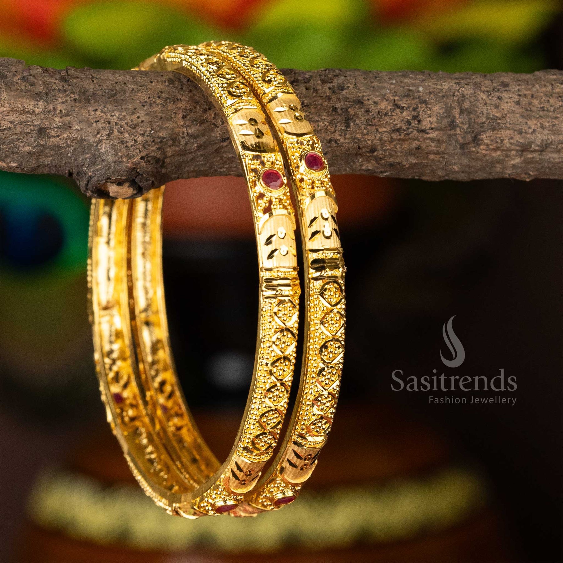 - Product Description: Savor the classic charm of our finely designed Gold Plated Forming Bangles, which are painstakingly made of high-quality brass to guarantee long-lasting sturdiness. Whether you're wearing modern Western clothing or traditional garb like graceful sarees, these bangles with their excellent design and stunning gold plating simply improve any ensemble. Their refined and stylish appearance goes well with any outfit because of their exquisite embellishments and graceful form, making them appropriate for every event, including elaborate parties and cultural celebrations. With AD stone accents, each bracelet replicates the grandeur of genuine gold jewelry, making them an alluring option to elevate your ensemble. These bangles are loved as gifts because of their timeless appeal. People in South India especially like them since they mimic traditional gold finishes.