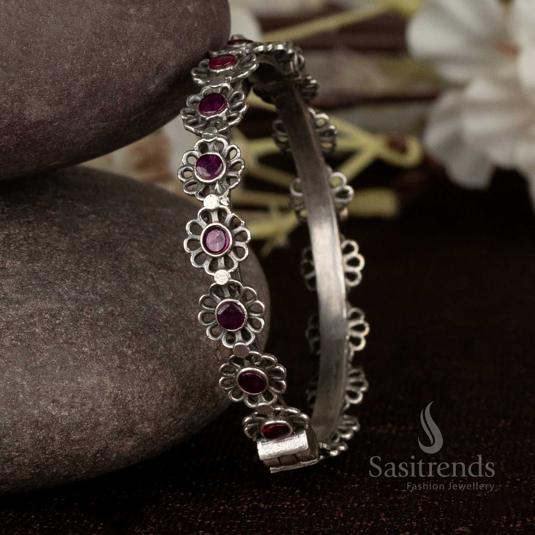 Luxurious antique oxidised kada bracelet with ruby stones and floral artistry, openable design ideal for stylish evening parties and cocktail celebrations – Sasitrends