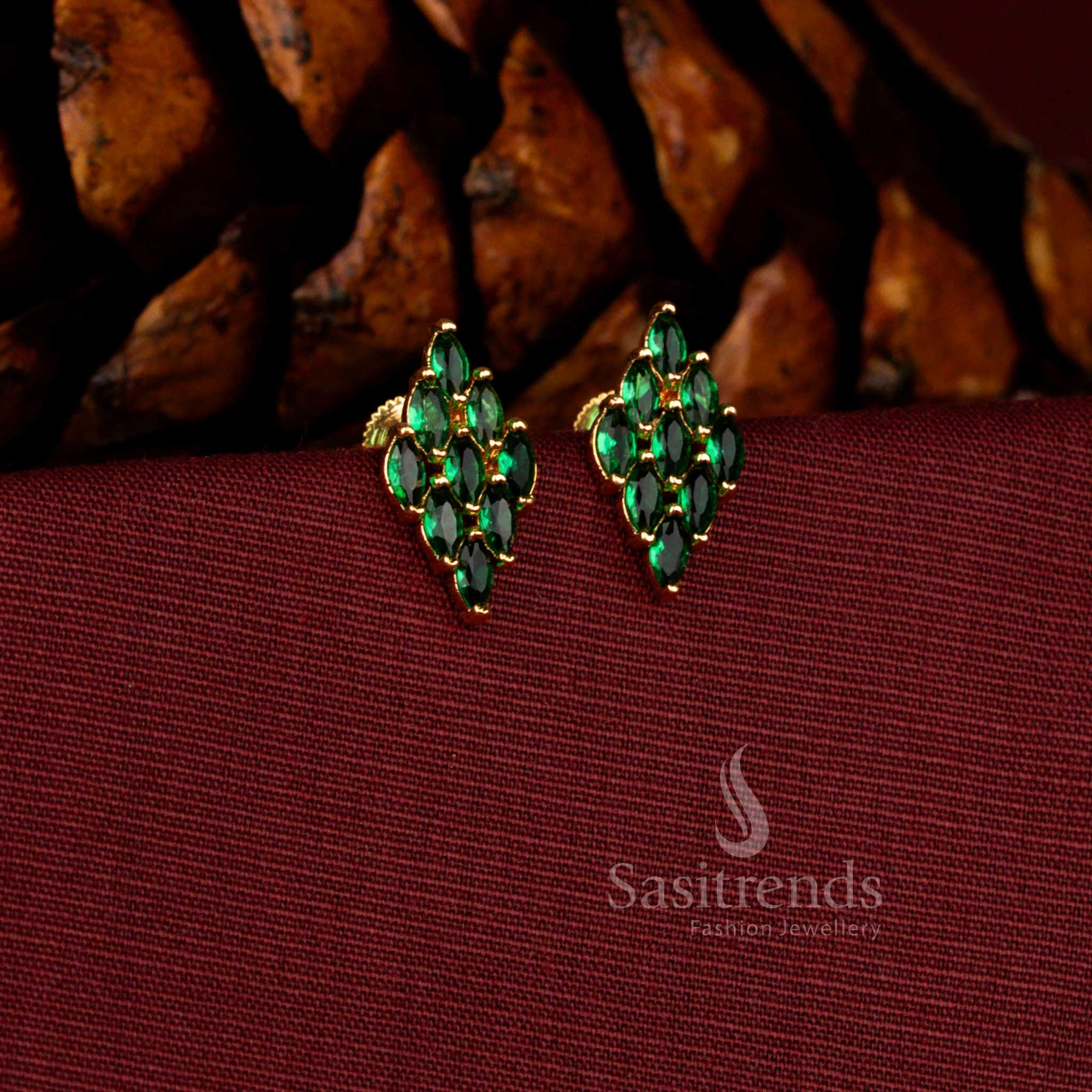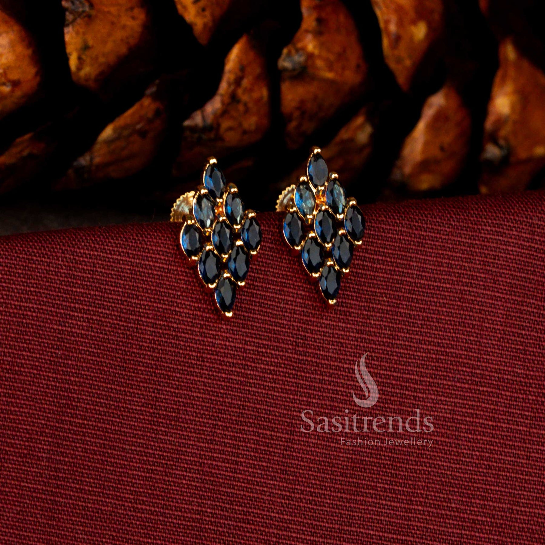 Description: Architectural precision meets ornamental grace micro gold plated in these mesmerising rhombus earrings. The design opens with a sharply defined diamond-shaped crown, encrusted with scintillating American diamonds, forming a bold geometric focal point.Suspended beneath, a finely sculpted floral medallion unfolds into a teardrop cascade, creating fluid movement and luminous brilliance. The interplay between angular symmetry and botanical softness gives these earrings a dramatic yet harmonious character.Rendered in guaranteed micro gold plating, this one gram jewellery creation glows with the sumptuous warmth of 24 carat gold. The elongated silhouette frames the face elegantly, making it a captivating choice for bridal ceremonies, evening receptions, temple festivities, and grand cultural celebrations.These earrings are not merely accessories — they are expressions of refined artistry, designed for women who embrace statement jewellery with poise and distinction.