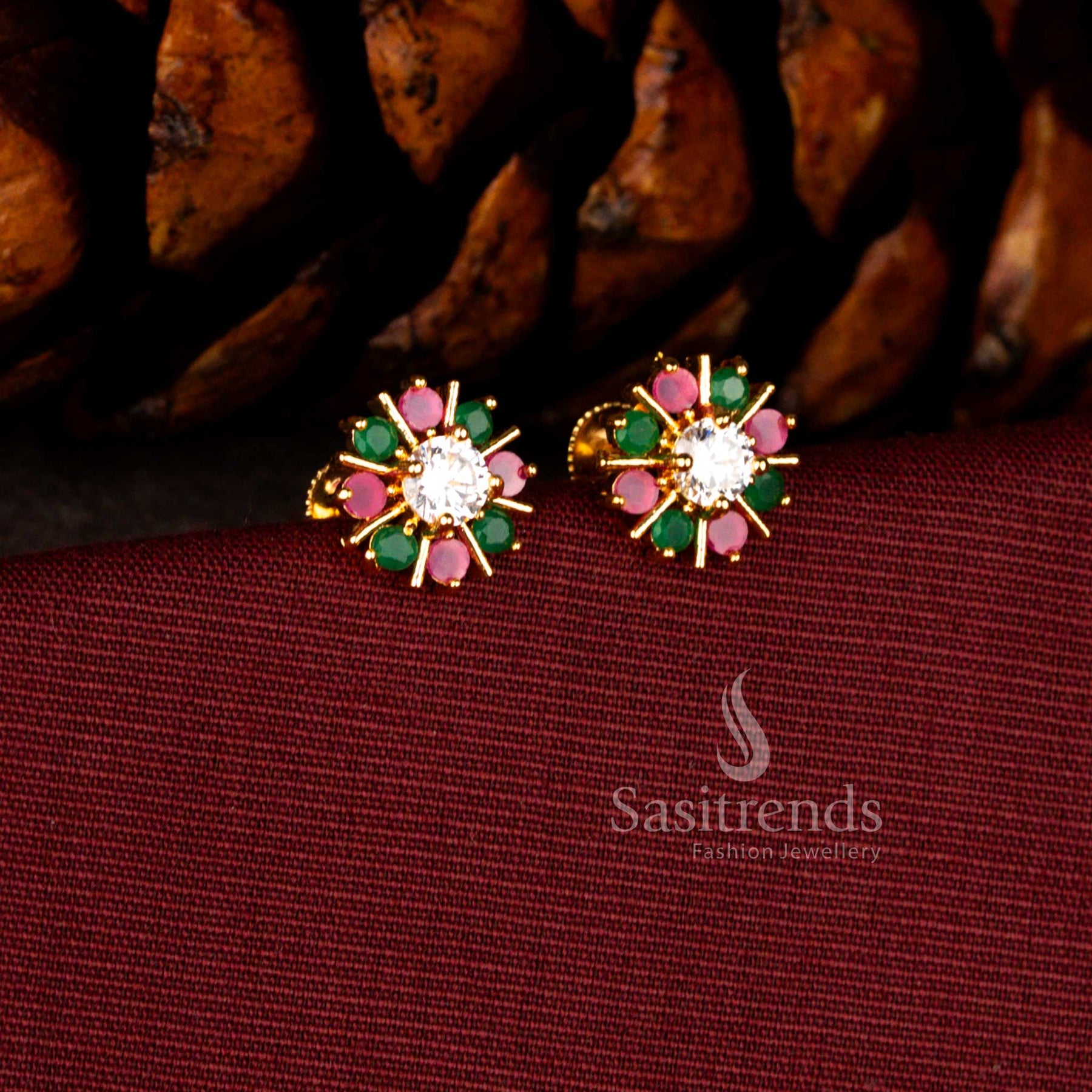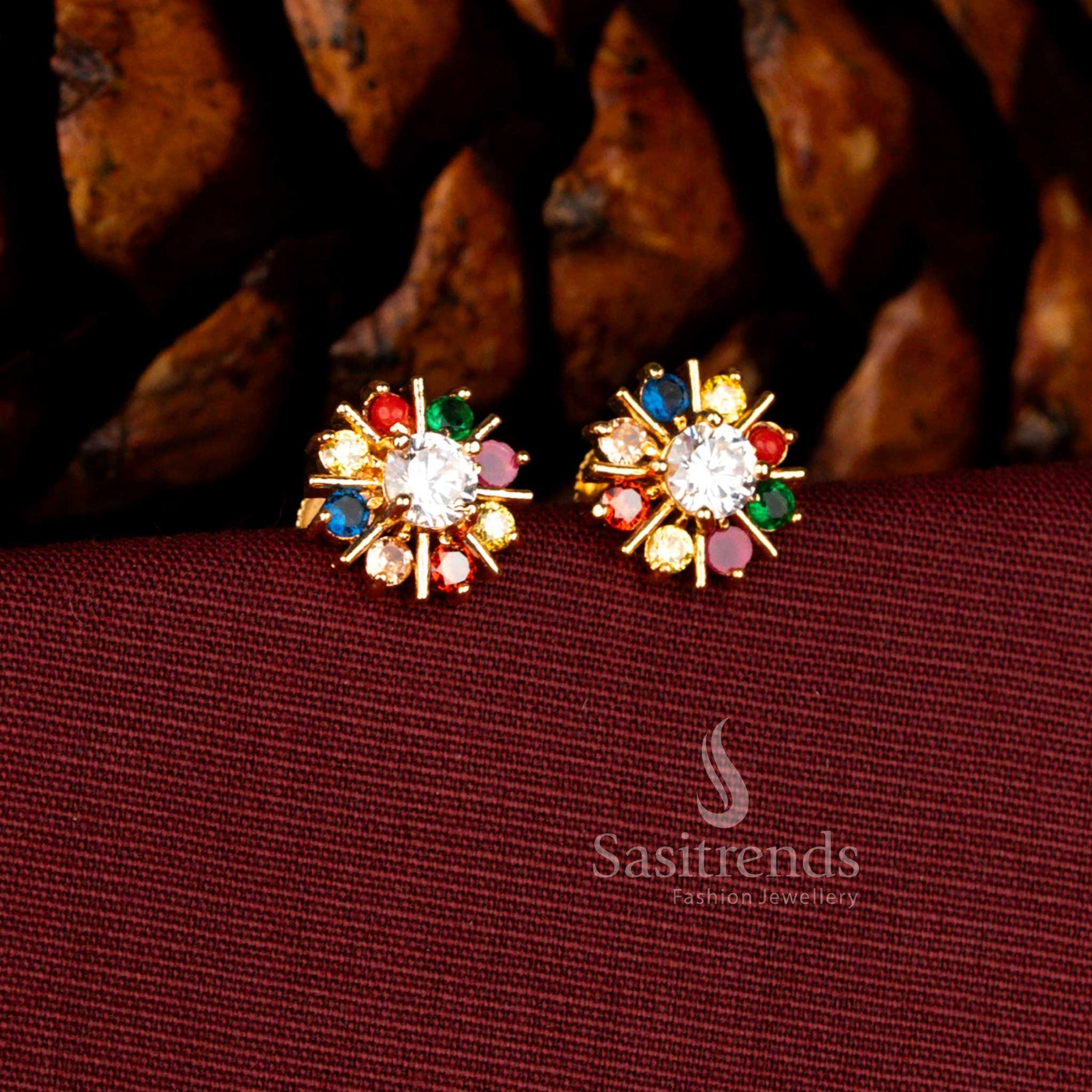 Stunning 24K Micro Gold Plated Sunburst AD Stone Stud Earrings with Radiant Center Crystal | Festive & Traditional Wear