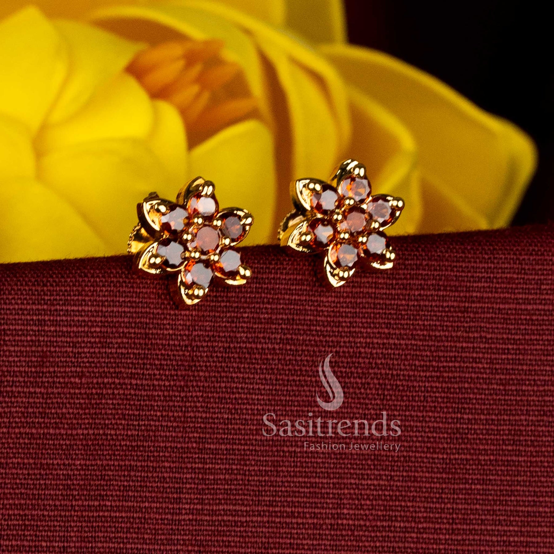 Sasitrends micro gold plated ruby AD stone floral stud earrings featuring detailed petal design and elegant craftsmanship