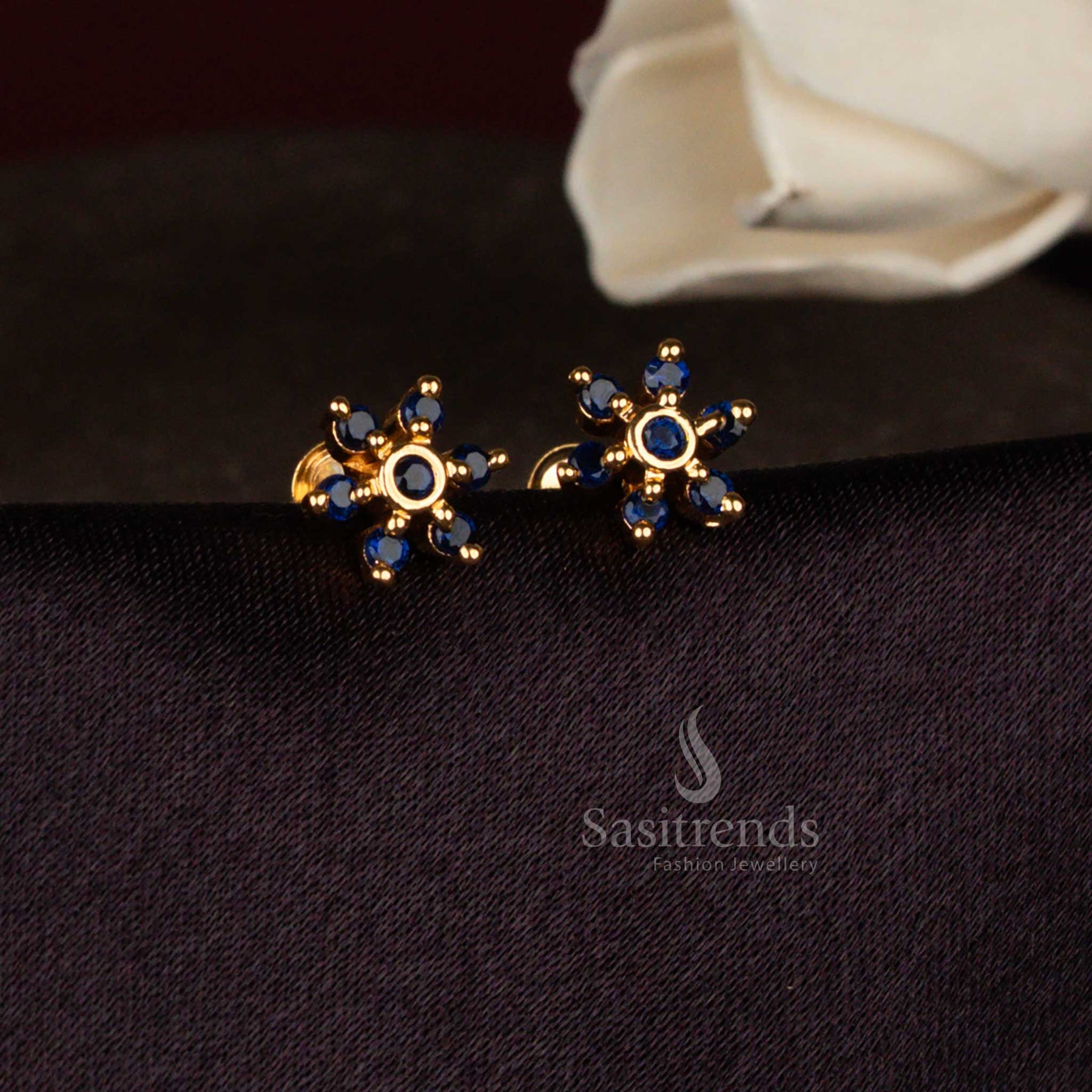 - Description: Inspired by classic gold stud patterns, these micro gold plated American diamond earrings from Sasitrends feature a radiant floral star design with clearly defined petal tips extending from a raised centre. The balanced star-like structure gives the earrings a bold yet graceful presence. Crafted using 24K pure gold micro plating, this design delivers a guaranteed one-gram gold look that closely resembles real gold jewellery. The smooth finishing and well-defined stud form enhance the richness, offering a polished appearance suitable for regular and occasion wear. The floral star layout is designed to sit evenly on the ear, creating a neat and confident look. This structured design makes the earrings an excellent choice for office routines, while still blending effortlessly into festive gatherings and traditional family functions. Pair these stud earrings with sarees, kurtis, salwar suits, or elegant ethnic fusion outfits. The star-inspired floral form adds traditional charm without overpowering your overall styling, making it a versatile addition to any jewellery collection. Perfect for women who prefer refined gold-look jewellery with dependable craftsmanship, these micro gold plated stud earrings reflect Sasitrends’ focus on lasting quality and timeless design. Ideal for personal wear or gifting, they bring everyday elegance with a real-gold feel.