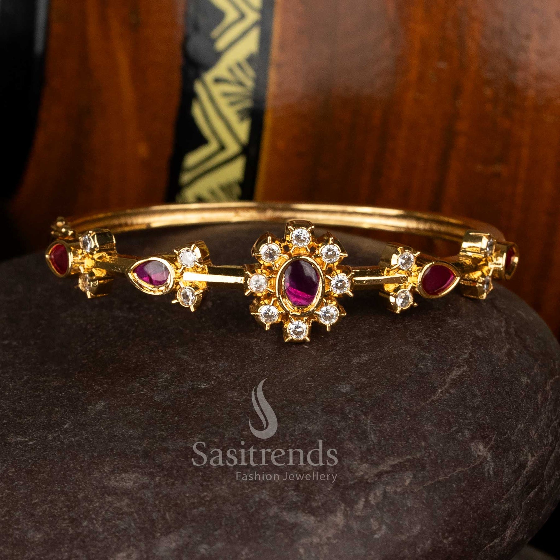 Sasitrends multi american diamond micro gold plated openable bracelet with floral centre design
