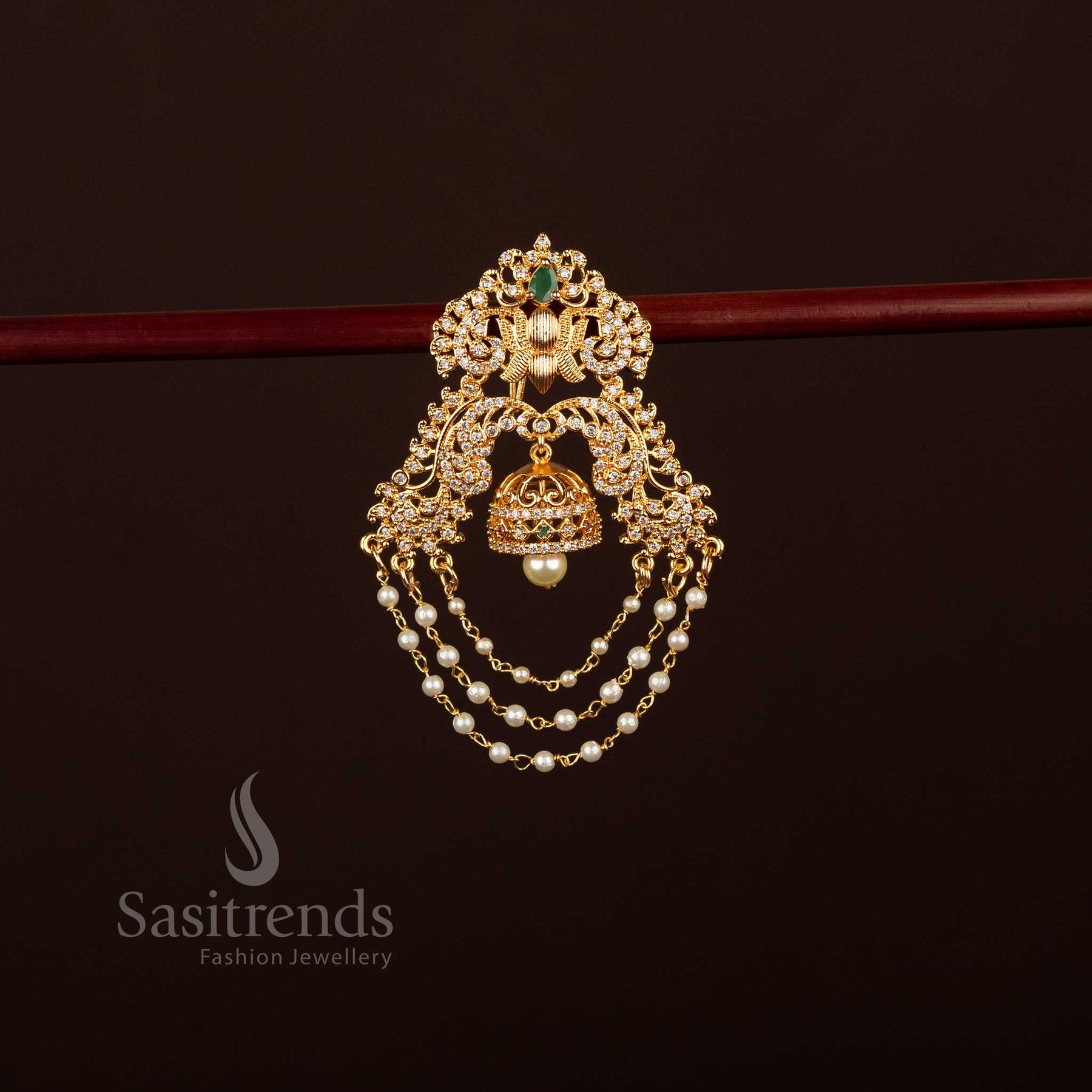 • Description: This premium bridal American Diamond Jada Billai from Sasitrends is crafted with 24K pure micro gold plating that gives a rich, real gold-like shine. Designed especially for wedding hairstyles, this piece features a detailed multi-layer structure ideal for traditional bridal looks and classical functions. At the top sits an intricate lotus-inspired motif, fully encrusted with bright American Diamond stones and highlighted with a ruby-toned centre stone. The carved detailing and symmetrical arrangement give this hair ornament a grand and luxurious appearance suitable for premium bridal wear. The centre portion features a beautifully sculpted dome-shaped jhumka. This jhumka is decorated with multi-colour AD stones in ruby and green tones and finished with a classic pearl drop. It adds a charming movement and a traditional temple-jewellery feel that enhances the entire bridal hairstyle. The lower section displays three perfectly structured pearl-beaded chains arranged in a triple-layer format. These pearl layers fall gracefully when worn on the braid, delivering an elegant cascading effect, which makes this jada billai perfect for wedding photography and premium occasions. Overall, this jada billai combines a lotus motif top, detailed AD work, a festive jhumka centre, and triple pearl chains to create a complete high-end bridal accessory. The micro gold plating ensures a long-lasting shine and a premium real-gold look, making it ideal for brides, bridesmaids, dancers, and anyone seeking an elevated wedding appearance.