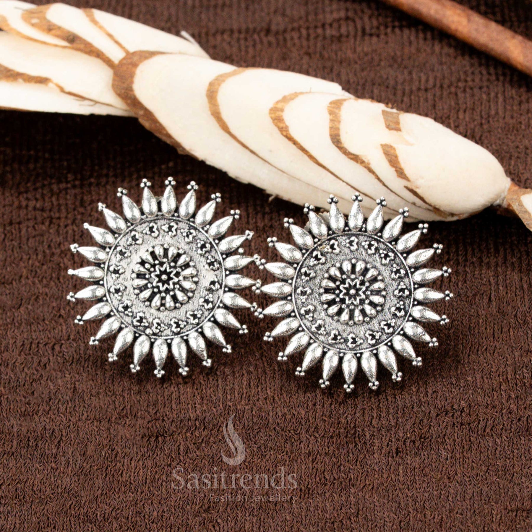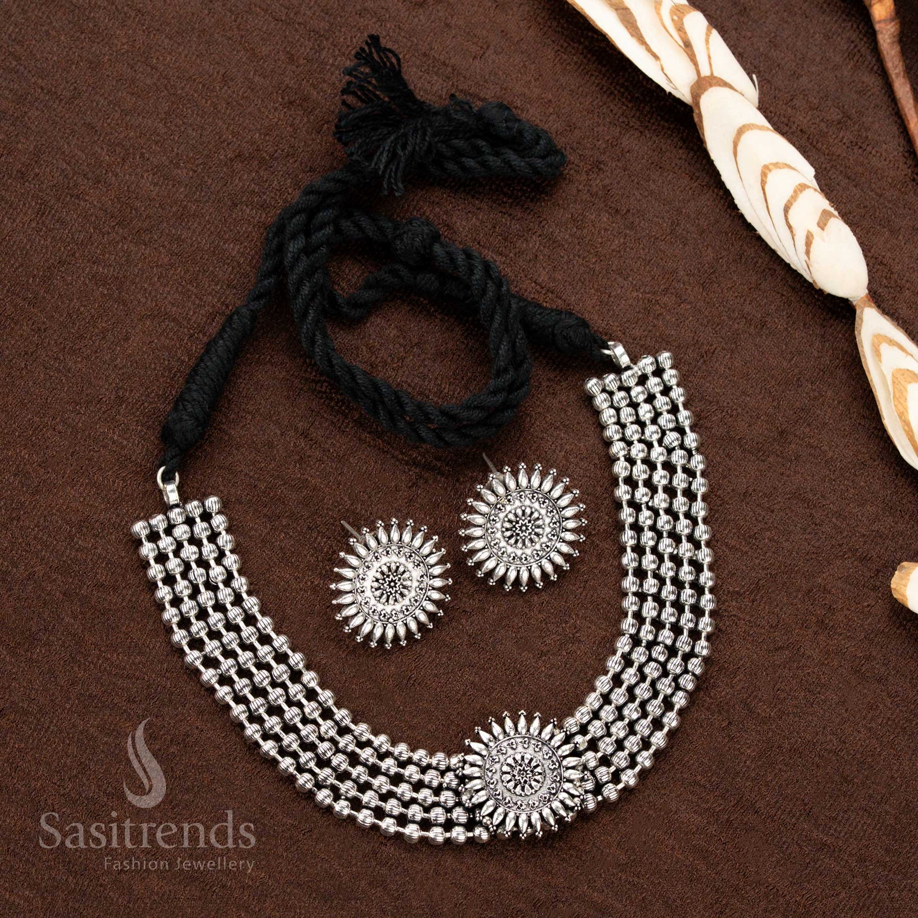 Amazing Traditional Navaratri Special Oxidised Silver Finish Choker Necklace Jewellery Set with Sunburst Center Design and Multi-Chain Beaded Necklace - Sasitrends