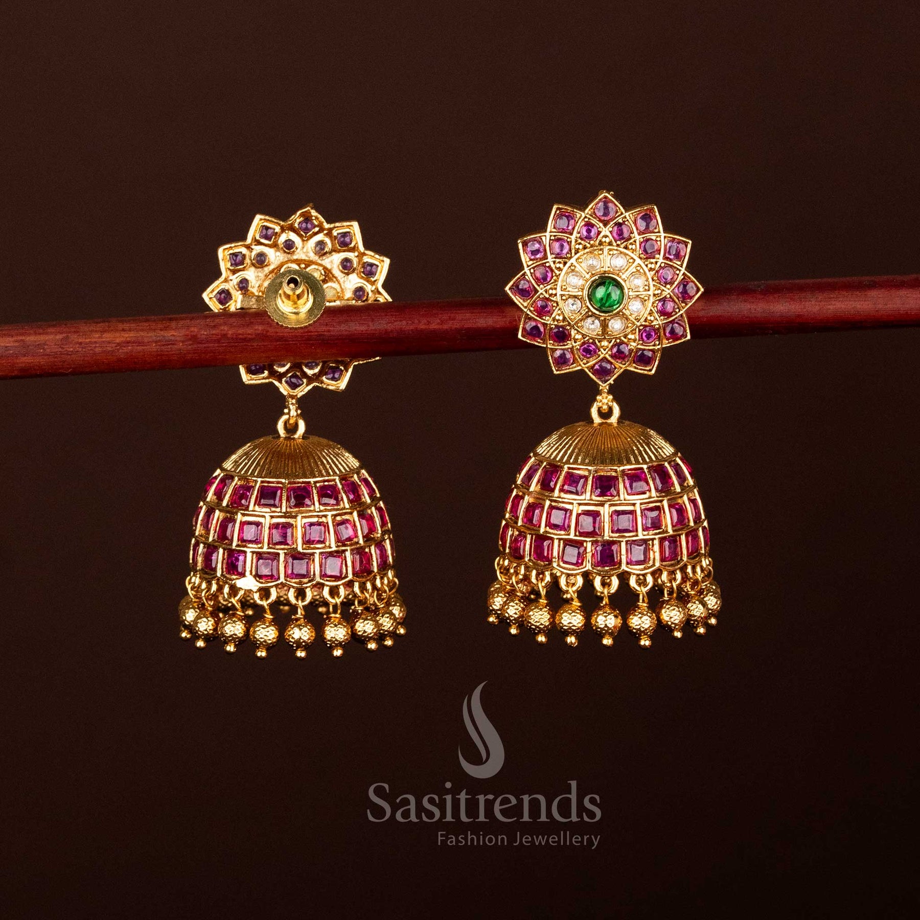 Charming lotus glow matte gold plated temple jhumka earrings with round and square stone details in multi colours for opulent style - Sasitrends