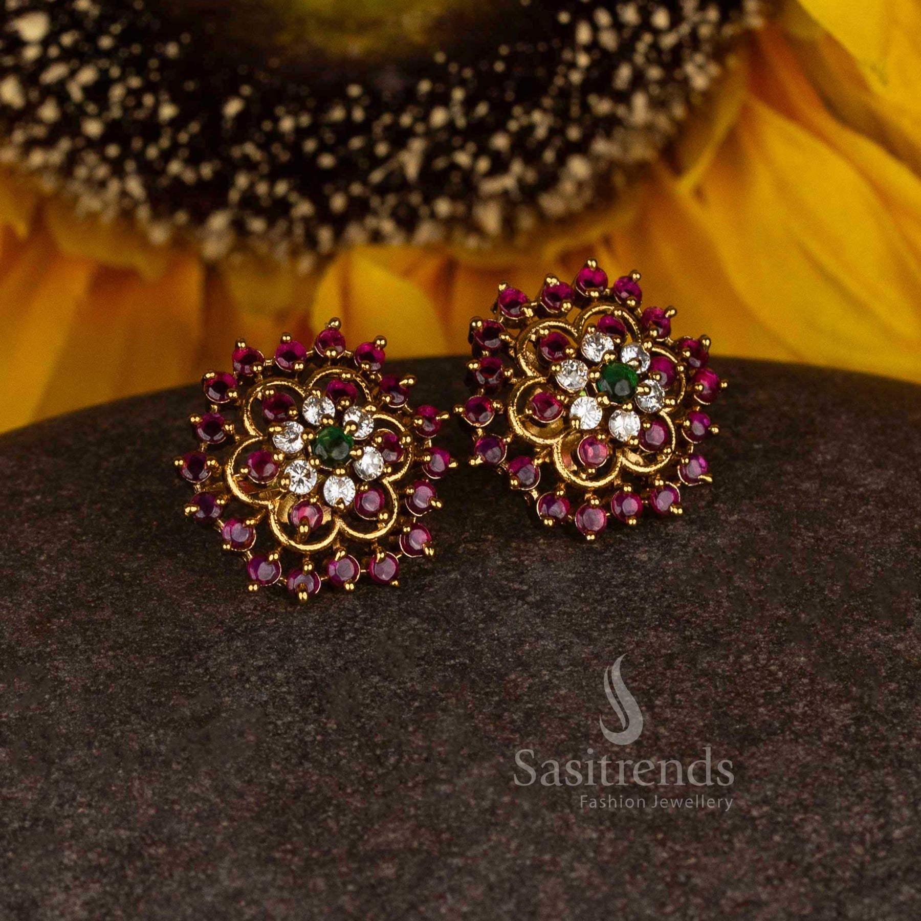 Ethereal Bloom Matte Gold Plated Temple Circular Floral Filigree Stud Earrings with Stone Detailing