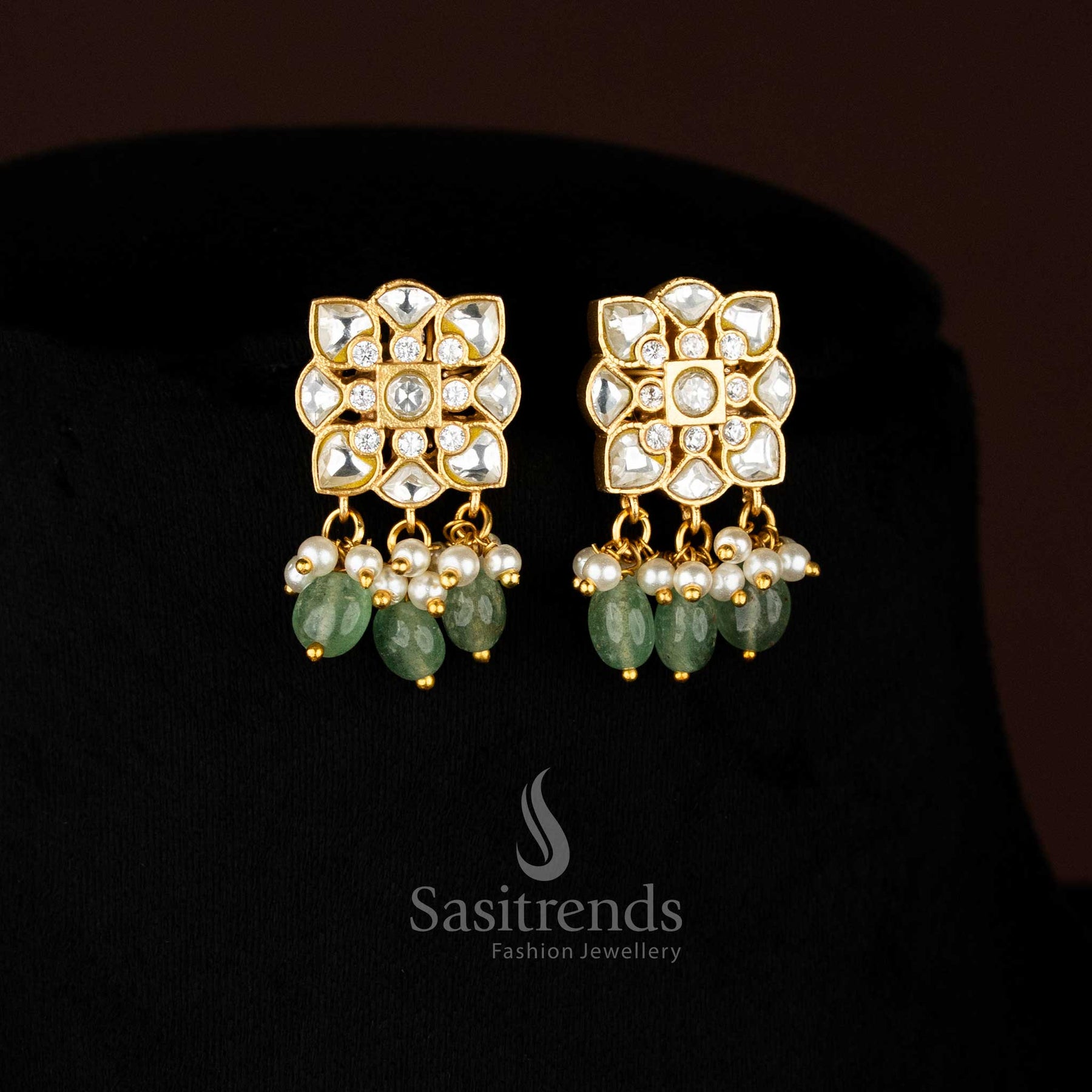 Traditional 24K Jadau Gold Plated Pearl Choker Necklace Set with Green Bead Hangings & Floral Pendant