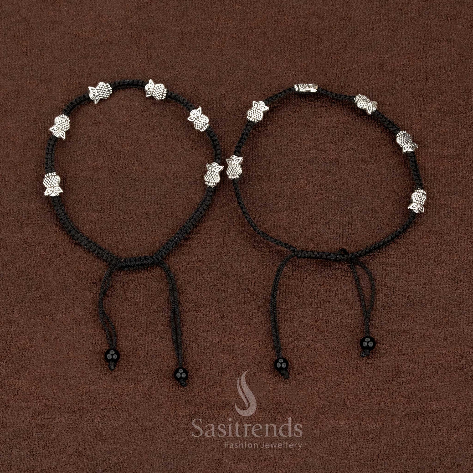 Vibrant Oxidised Black Thread Anklets with Stranded Size Featuring Elephant, Owl ,Ball & Butterfly Charms for Cultural & Casual Wear