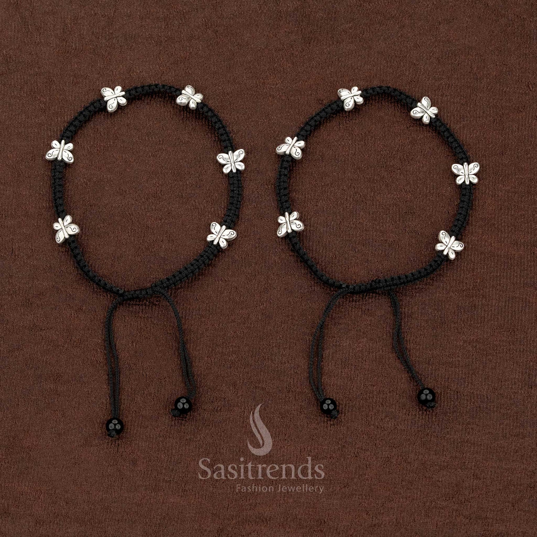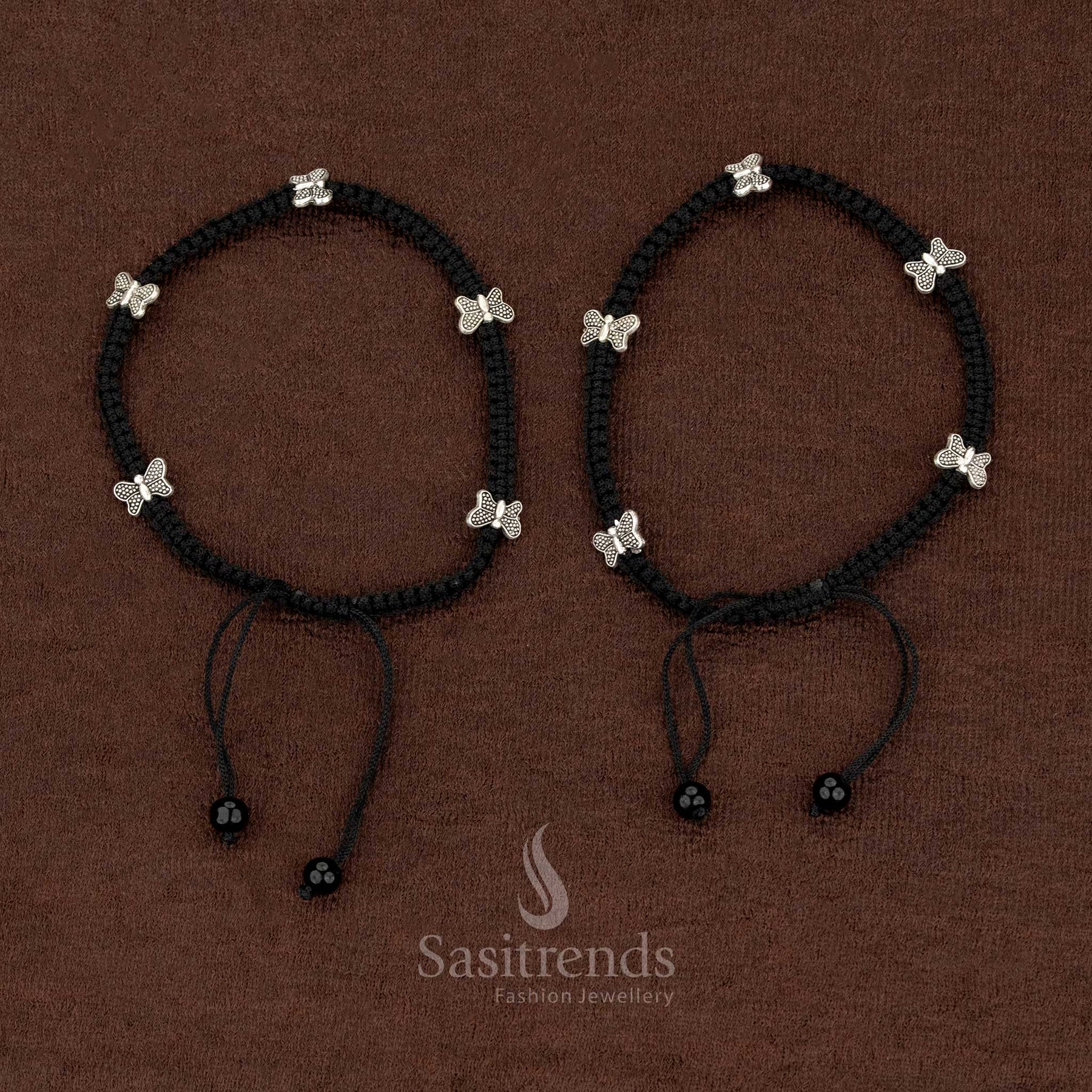 Description: Bring playful charm and character to your ensemble with these vibrant oxidised black thread anklets. Designed with a stranded pattern, each anklet showcases a unique combination of charms including an elephant, owl, spherical ball, and two distinct butterfly motifs (Butterfly-1 and Butterfly-2). These oxidised charms capture attention with intricate detailing and a textured metallic finish, providing a contemporary twist to traditional anklet styling. Perfect for cultural events, casual strolls, college outings, temple visits, art performances, or beach walks, they complement sarees, skirts, dresses, and fusion outfits effortlessly. The adjustable stranded sizing allows a comfortable and secure fit for different ankle shapes. These anklets make a statement for those who appreciate bold, artistic designs and playful accessories that enhance your style narrative. Ideal for gifting or adding a standout accessory to your personal collection, these oxidised anklets transform every step into an expression of creativity, charm, and lively elegance.