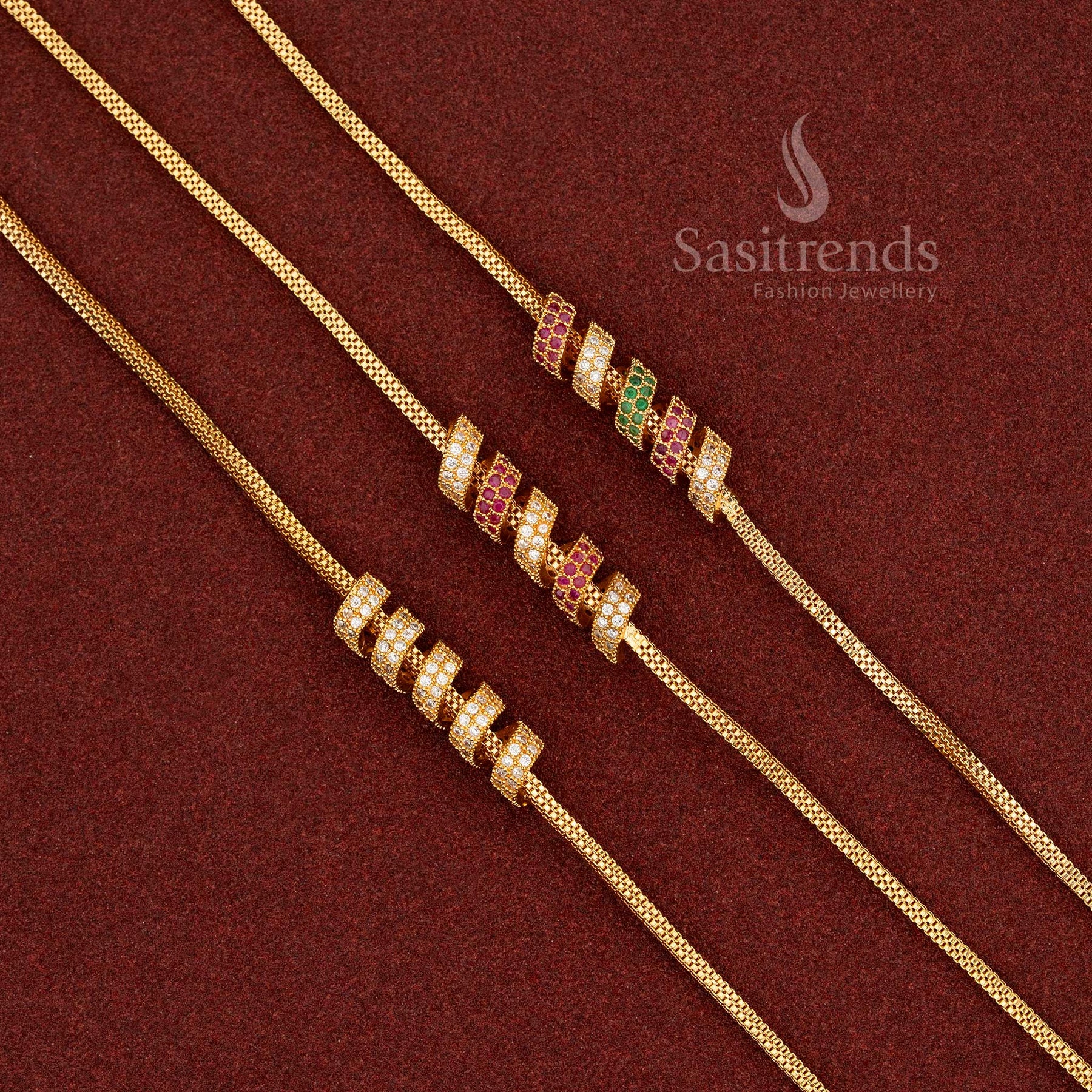 - Description: Elevate your ethnic ensemble with this beautifully crafted one gram gold plated Mugappu chain. Featuring a rich three-layer design with a central barrel-style Mugappu, this chain is adorned with shimmering AD stones in green, ruby, and white tones. The intricate detailing and precision-cut stones create an elegant contrast that mimics the look of real gold jewellery. Each layer of the mesh-style chain merges into a traditional aesthetic, making it an ideal pick for festive and traditional occasions.Designed using 24 Carat Pure Gold Micro Plating technology, this chain offers a luxurious gold finish that is guaranteed to retain its sheen over time. The Mugappu centerpiece with alternating AD stone segments enhances the regal look, ensuring it pairs well with silk sarees, temple wear, and wedding functions.Perfectly suited for traditional women who love timeless pieces, this chain gives a classic appeal and sits beautifully around the neckline. Whether you're gifting or adding it to your own collection, this one is a versatile ethnic essential that looks like real gold and adds value to every outfit.