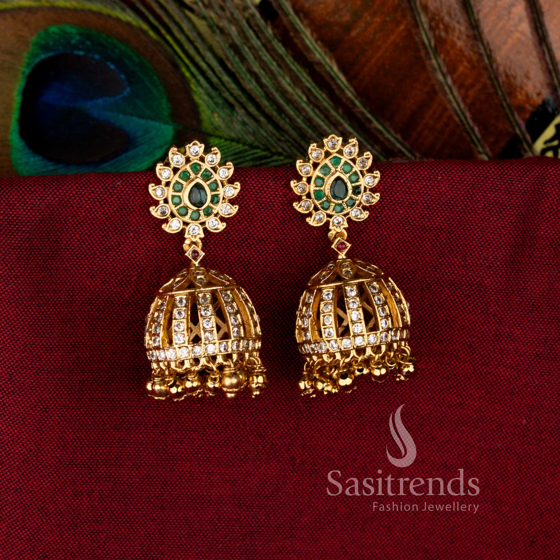 - Description: Bring home the essence of tradition and grandeur with these temple-inspired matte gold plated AD stone studded jhumka earrings. Designed for those who admire intricate temple artistry, these earrings are perfect for bridal, festive, and wedding wear. The earrings feature a stunning floral stud with green temple-inspired detailing that beautifully frames the centerpiece. The cascading dome-shaped jhumka is studded with sparkling AD stones, giving a radiant finish that enhances any bridal or festive look. Each element of these earrings reflects premium craftsmanship – from the carefully placed stones to the ornate hanging ghungroos at the base. The temple matte gold plating adds an antique charm that pairs beautifully with silk sarees, lehengas, or traditional attire. These earrings are more than just accessories; they are a statement of heritage and timeless design. Ideal for weddings, engagements, and festive celebrations, they instantly elevate the wearer’s look with a royal touch. Make every occasion special with these premium temple matte gold plated AD stone studded jhumka earrings, designed to be treasured for years as a part of your jewellery collection.