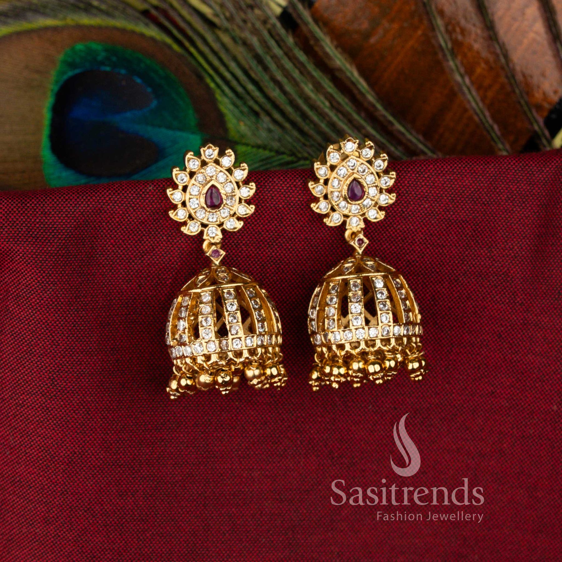 Premium Temple Matte Gold Plated Floral Studded AD Stone Dome Jhumka Earrings with Hanging Ghungroos