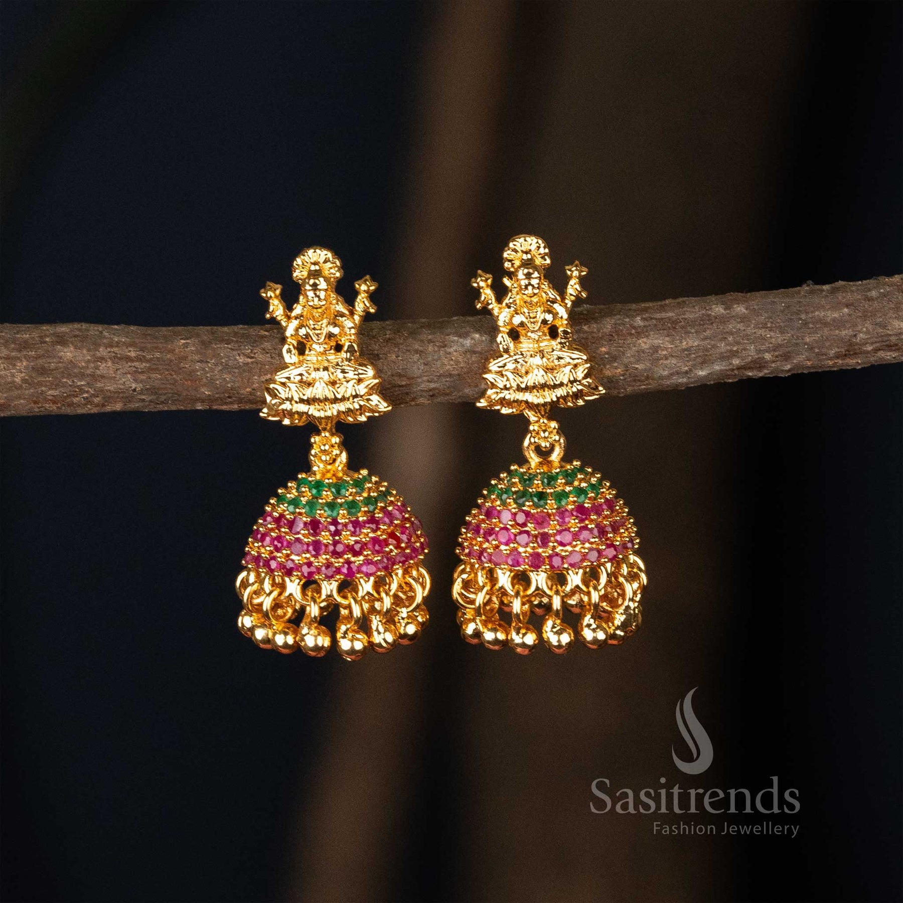 Majestic ruby-green colour micro gold plated flower designer jhumkas earrings enhanced with divine god motif, a perfect choice for traditional wedding wear - Sasitrends