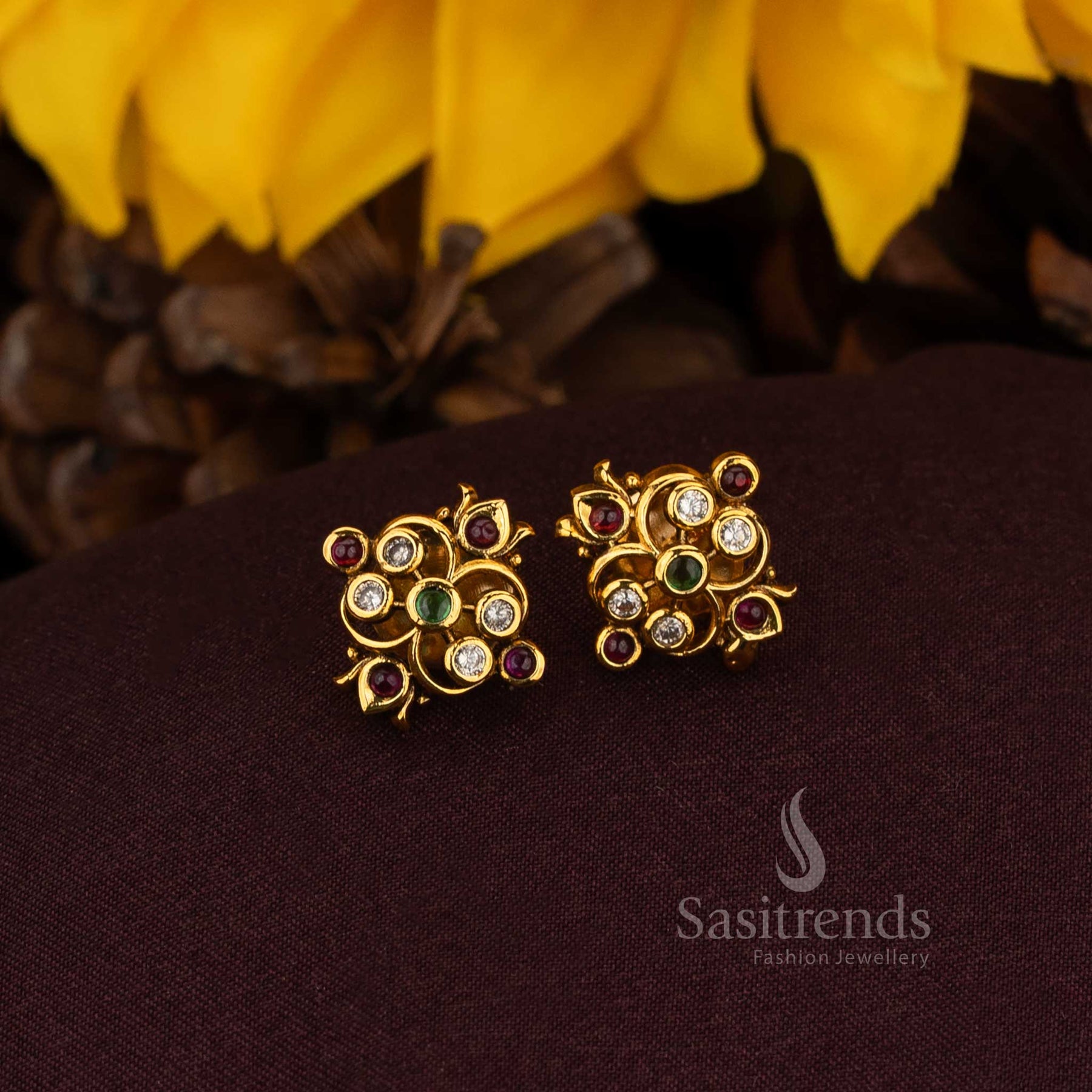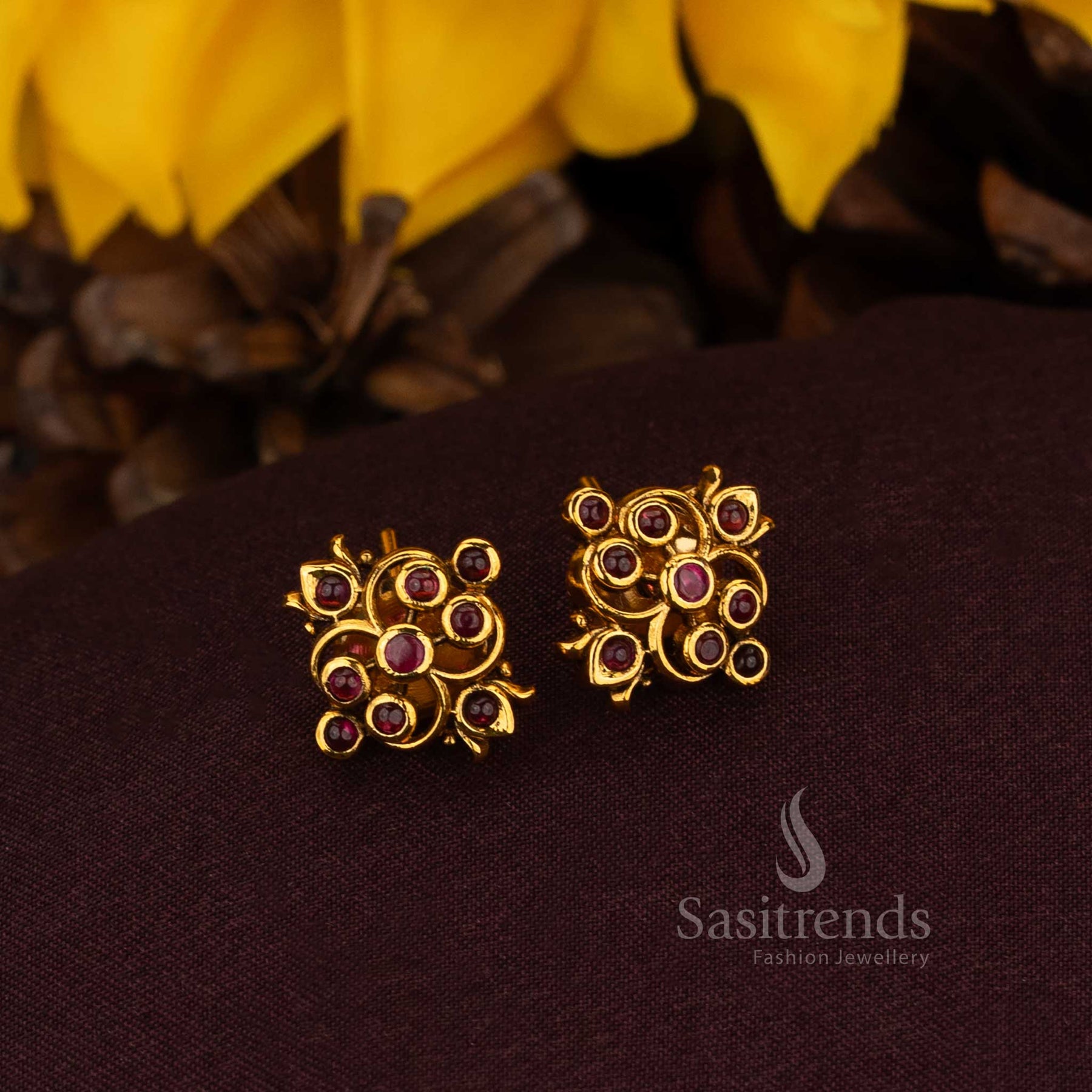 - Description: Indulge in timeless artistry with these exquisite Matte Gold Plated Floral Cluster AD Stud Earrings. Designed with a delicate balance of tradition and elegance, these studs showcase a free-flowing floral vine motif, where rounded accents are carefully arranged like blossoming buds, complemented by subtle leaf-inspired extensions. The meticulous craftsmanship creates a sense of natural rhythm, making each piece a work of art to cherish.The matte gold plating enhances the intricate details, lending a regal yet refined aura. Embedded with shimmering AD embellishments, the earrings radiate a graceful sparkle, making them the perfect choice for elevating traditional attire. Their organic structure and nature-inspired elegance celebrate both heritage and contemporary styling, allowing you to pair them effortlessly with sarees, lehengas, or festive ensembles.Ideal for weddings, cultural festivals, family functions, or temple visits, these earrings embody a luxurious spirit that speaks of sophistication and devotion. Their cluster design adds depth and richness, ensuring that every glance captures their beauty.With these earrings, you embrace not just jewellery but a story of artistry, heritage, and grace.