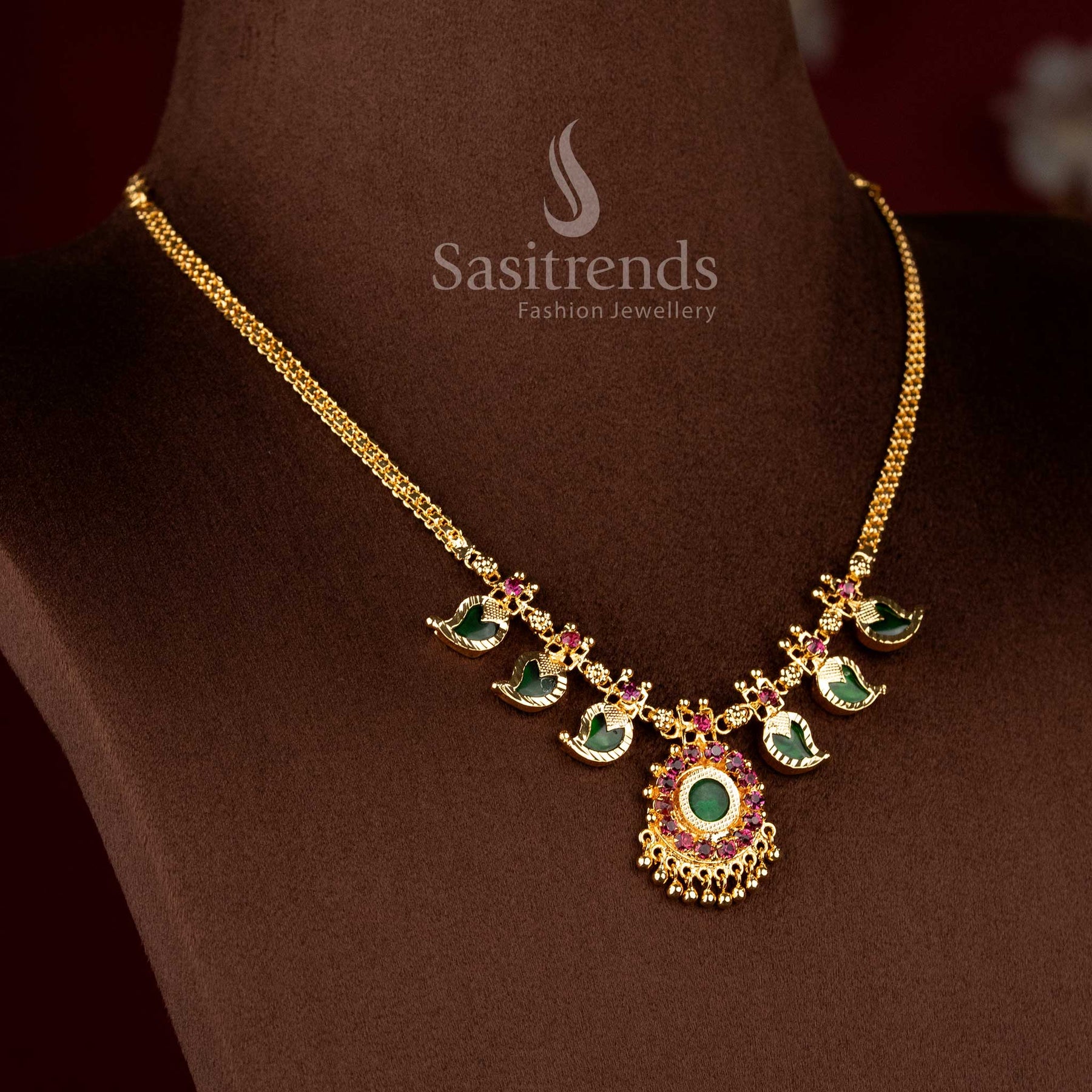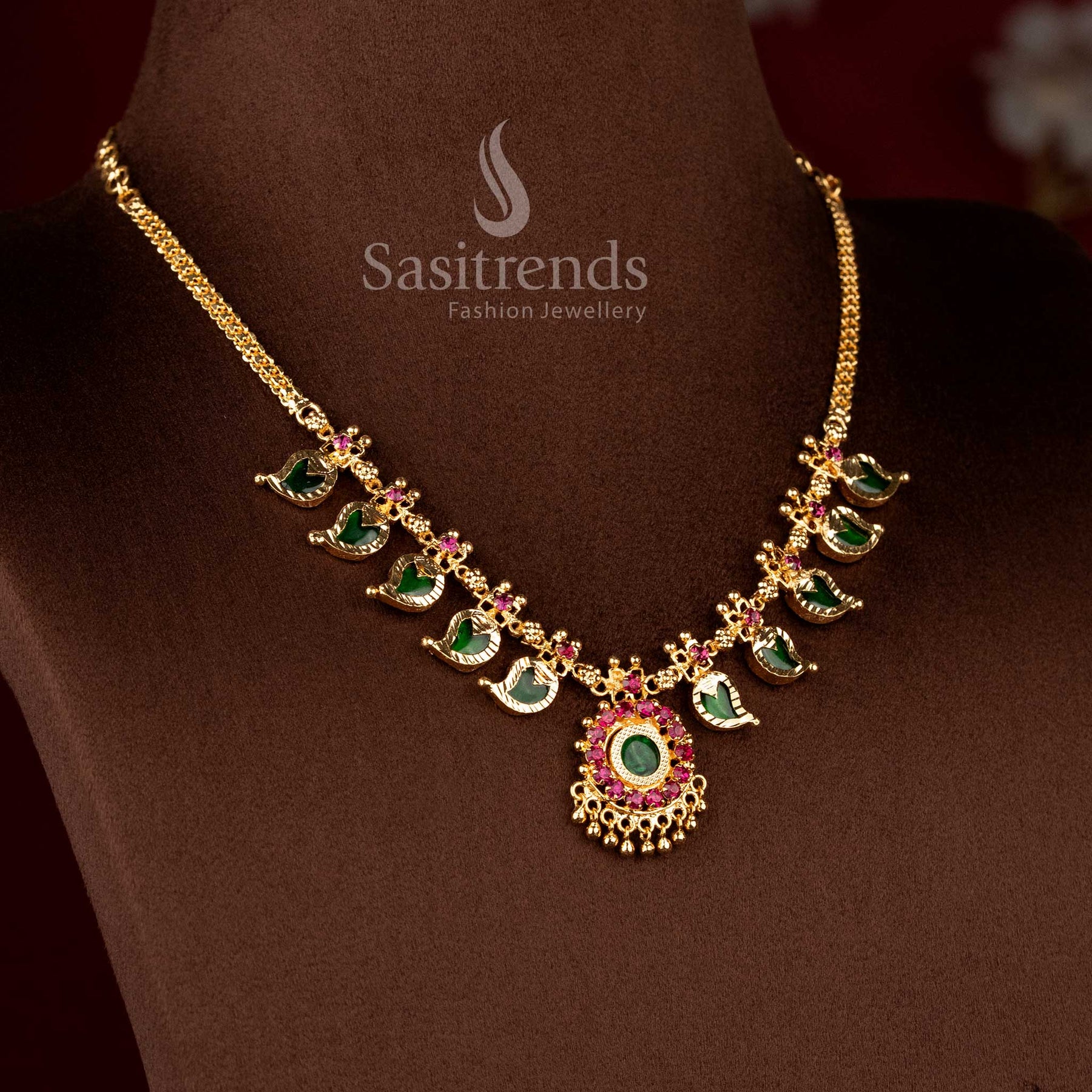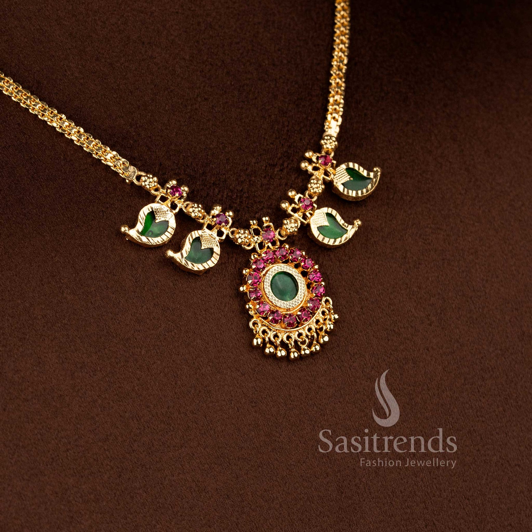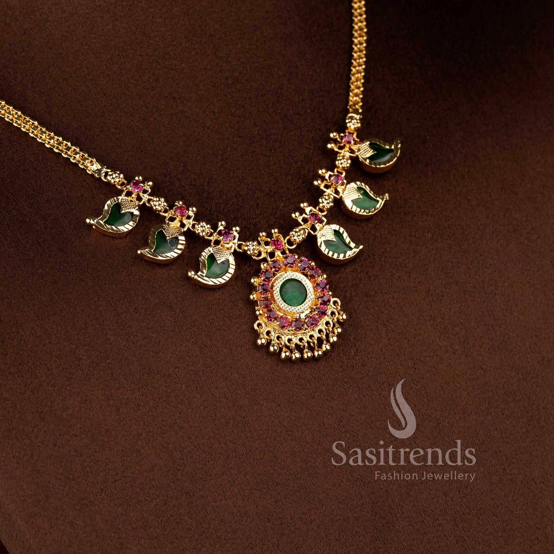 Micro Gold Plated Kerala Traditional Mango Leaf Palakka Necklace with Green Stone Pendant | Sasitrends