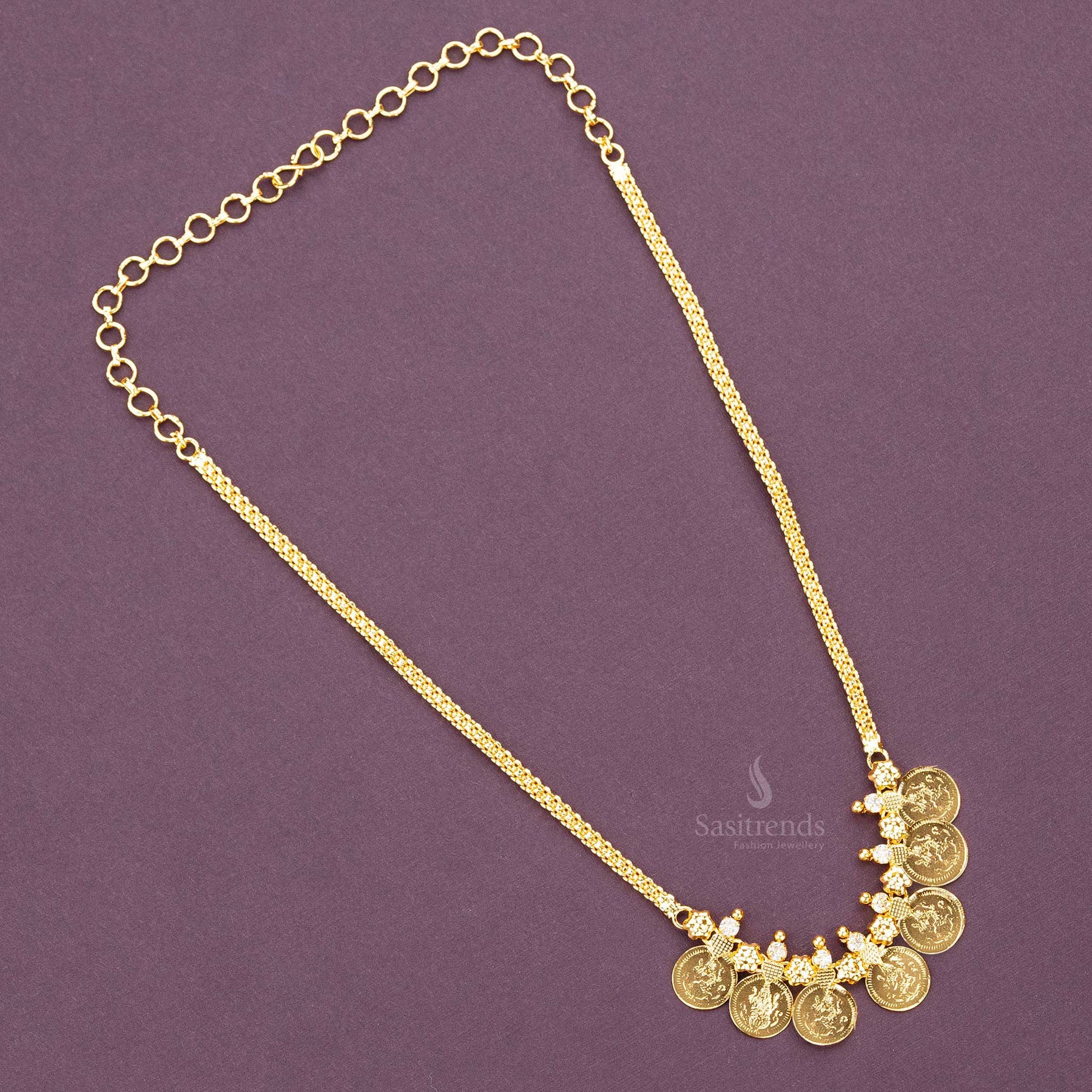 - Product Description: This stunning Micro Gold-Plated Lakshmi Coin Necklace features a series of intricately designed Lakshmi coins, each adorned with shimmering AD stones. The coins are separated by elegant flower motifs, adding a touch of sophistication to this traditional design. Crafted with care, the coins are securely attached to a flexible chain, complemented by an adjustable 22 cm ring back chain for a perfect fit. This necklace is available in three beautiful color variations: White, Ruby, and White-Ruby. Ideal for traditional events, this necklace brings together the elegance of Kerala-style jewellery with a modern twist, all backed by a 1-year guarantee.