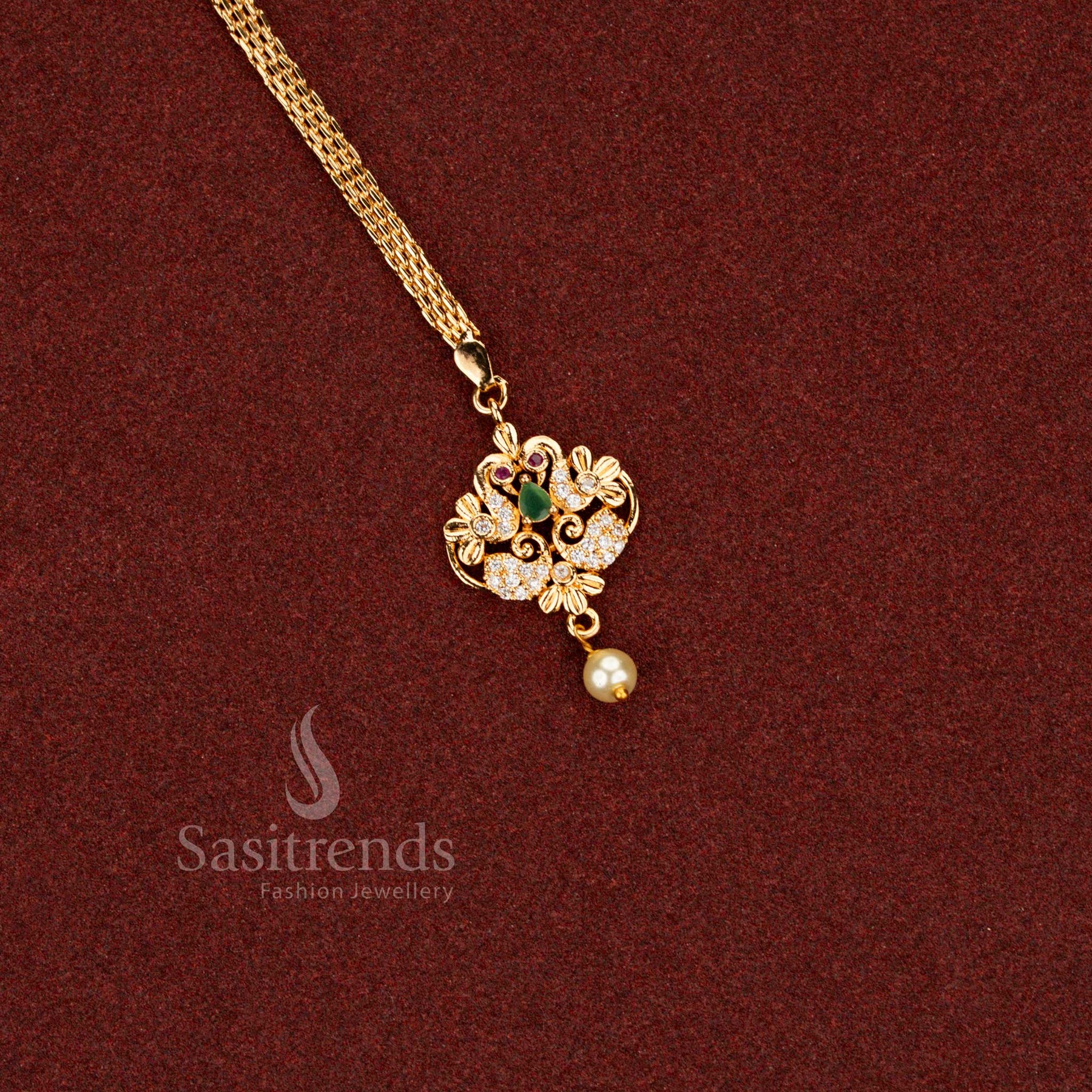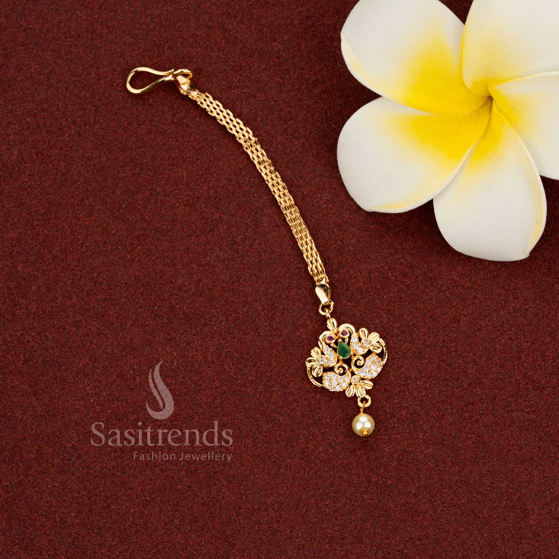 Description: This elegant maang tikka from Sasitrends is crafted in a traditional peacock-inspired design, highlighting classic Indian jewellery artistry. The centre features a prominently placed American Diamond stone, designed to sit perfectly along the hairline and enhance the overall bridal look. The peacock motif is formed using closely set AD stones, arranged to define the curved feather structure with fine detailing. The symmetrical layout gives the piece a balanced and graceful appearance when worn. The lower portion is finished with a delicate pearl drop, adding gentle movement and traditional charm. The maang tikka is completed with a fine linked chain structure, ensuring comfortable wear and secure placement. Finished in 24K micro gold plating, this piece offers a guaranteed real gold look, making it suitable for weddings, traditional ceremonies, and festive occasions.