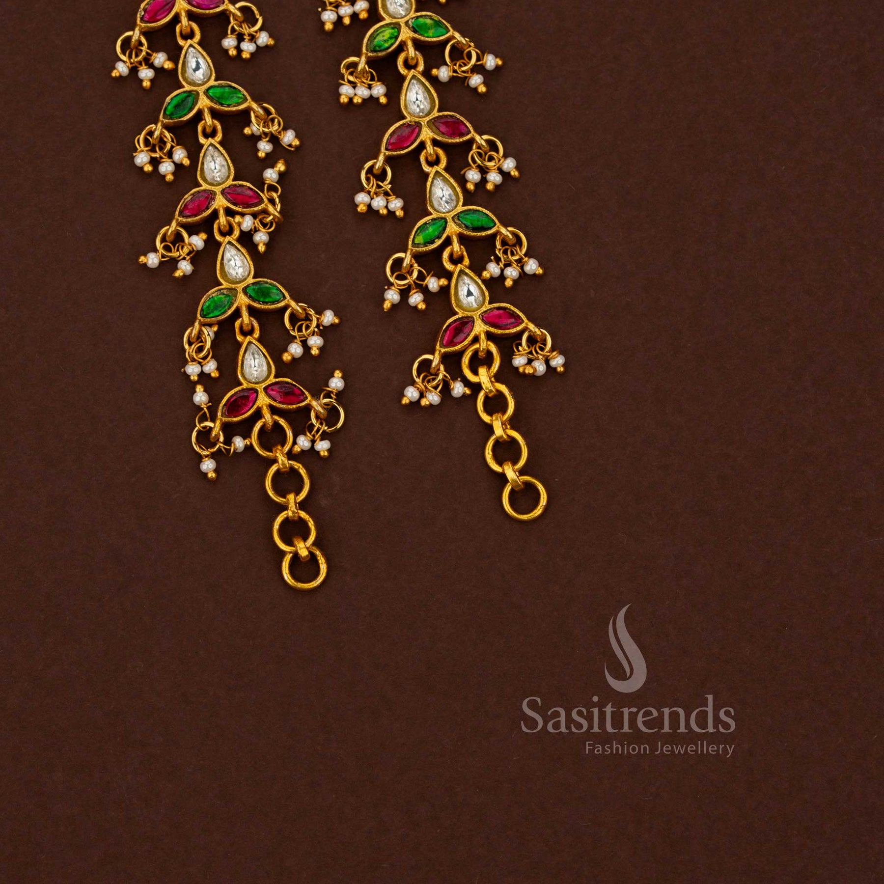 Elegant Jadau Kundan Gold Plated Tier-Drop Floral Branch Silhouette Pearl Straight Matil – Bridal Heritage Jewellery with Royal Finish