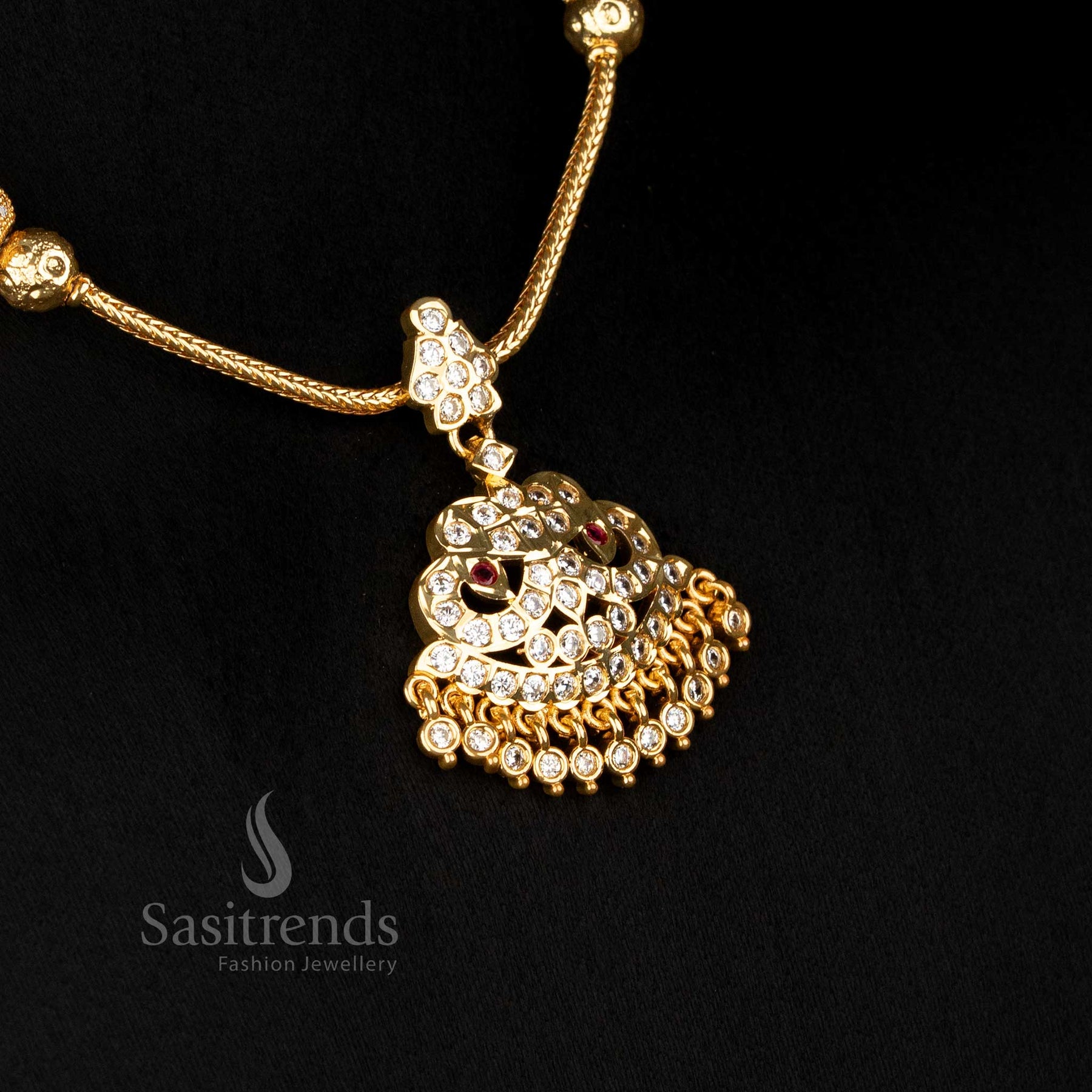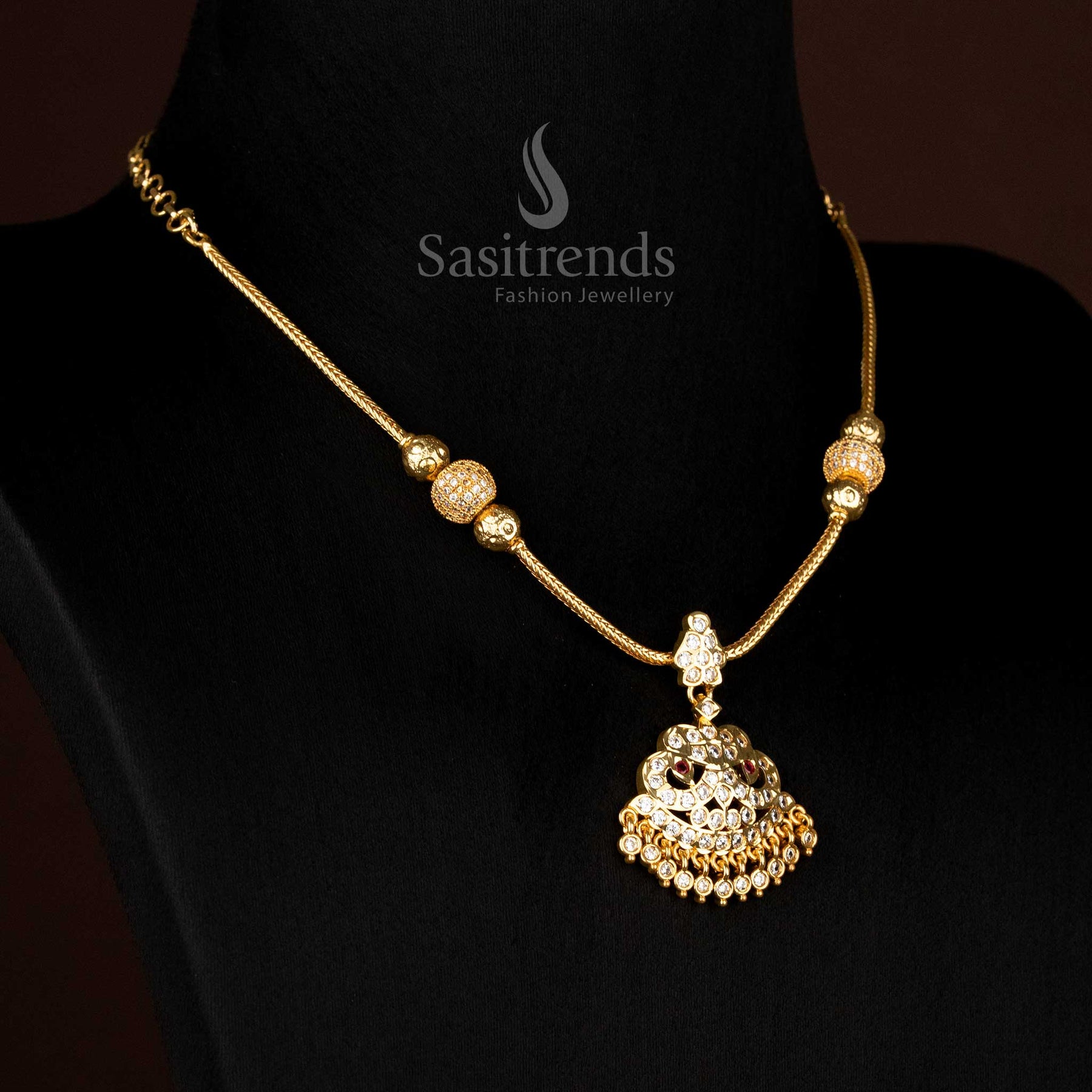 - Product Description: Elevate your ethnic charm with our timeless Traditional Attigai Necklace. The pendant boasts an exquisite arrangement of American diamond stones, suspended elegantly on a flexible snake chain adorned with a central studded ball. That ball is placed in the middle of the chain and fully studded with AD stones, and it's supported by two additional balls for added grace. Crafted from high-quality brass, this necklace is meticulously plated with one gram of micro gold using 24-carat pure gold, exuding opulence and radiance. It's studded with American diamond stones, adding a touch of brilliance to the piece. A versatile addition that complements sarees, half sarees, and various traditional ensembles. This attigai necklace is an impeccable choice for weddings, birthdays, and festive occasions, adding a touch of regal allure. An ideal gift for cherished individuals—mothers, daughters, wives, and sisters. Explore our online collection for this gold-plated addigai necklace, blending tradition with modern elegance.