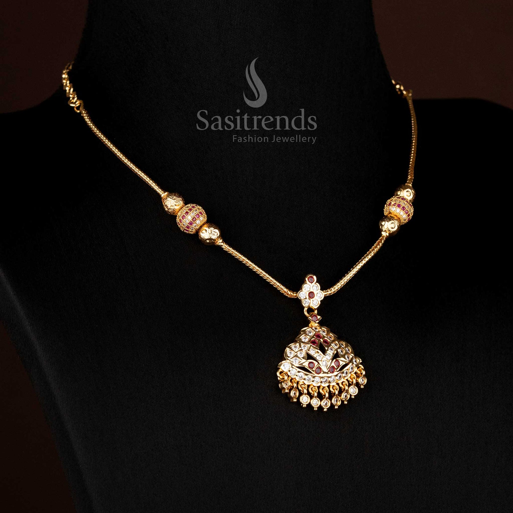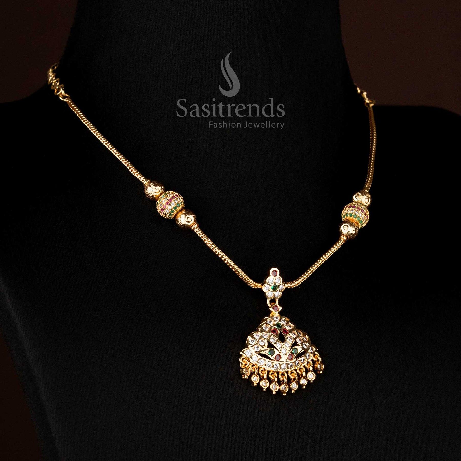 Brand: Sasitrends creates jewellery with authentic temple-inspired structures, detailed craftsmanship, and long-lasting finishes. Every design is carefully made with real-gold-look micro plating, traditional detailing, and guaranteed shine suitable for festive and bridal styling.