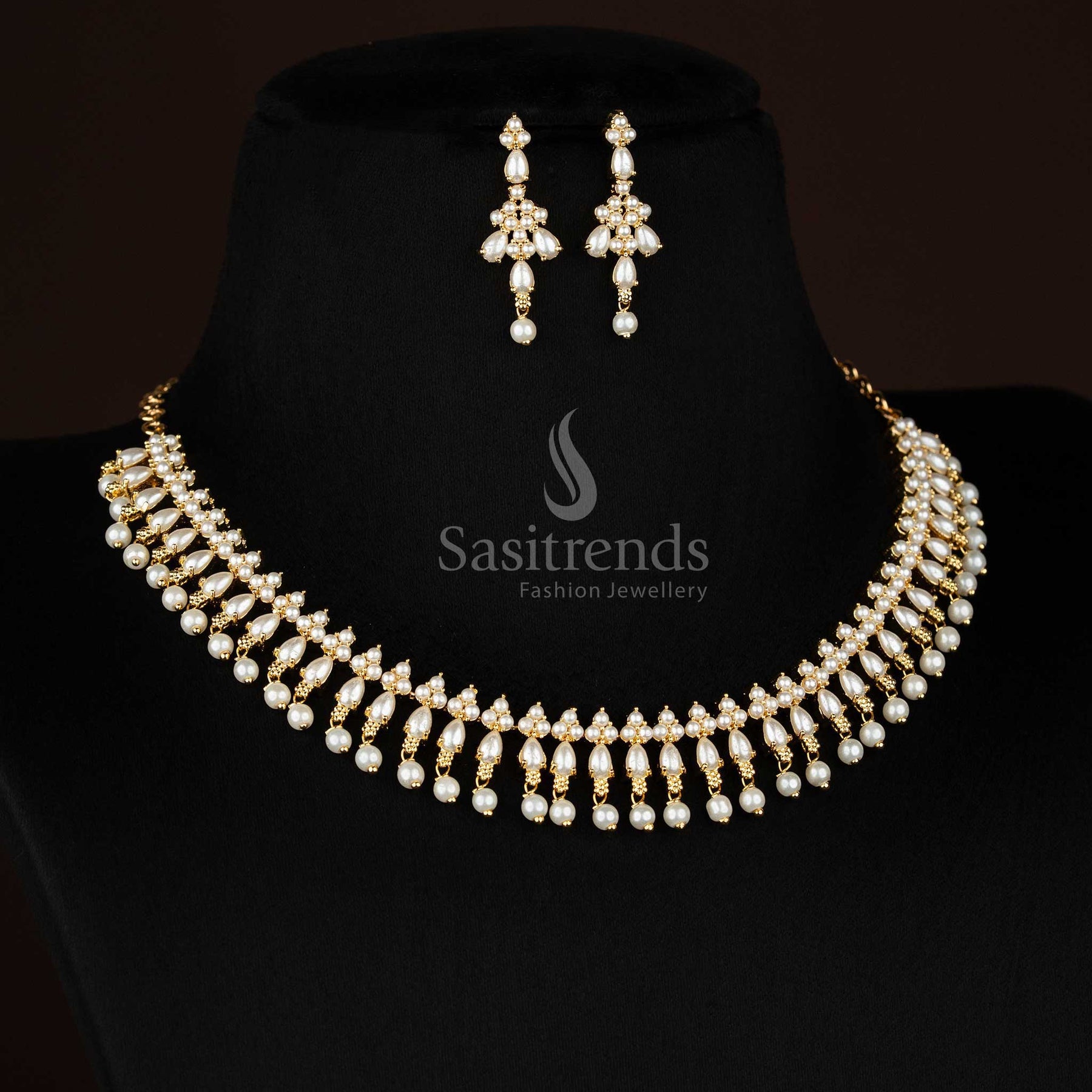 Wonderful Micro Gold Plated Triangle Cut Pearl & Teardrop American Diamond Necklace Set with Pearl Drops for Evening Festives