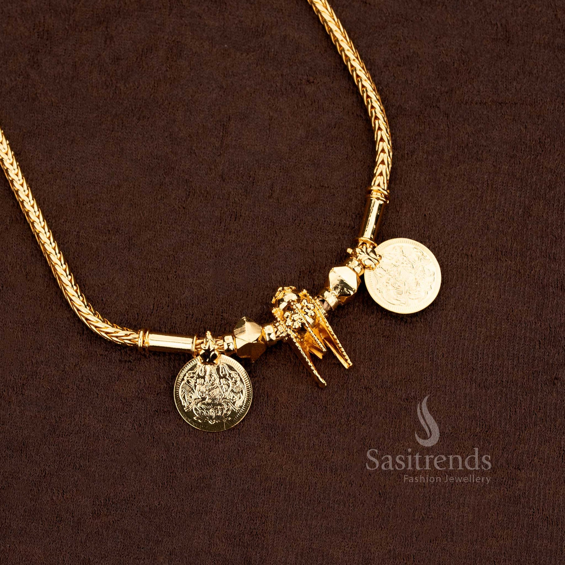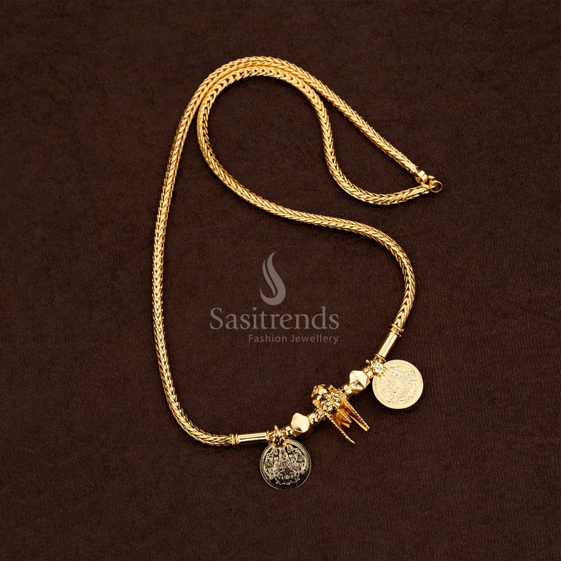 - Description: Celebrate tradition with the Sasitrends Micro Gold Plated Thali Chain Collection, featuring exquisite designs of Sivan Pattai Thali, Namam Thali, and Thennai Maram Thali. Crafted with 24-carat micro gold plating, these thalis emulate the richness and elegance of real gold, making them perfect for temple wear, Sasree occasions, and gifting to mothers, grandmothers, sisters, or loved ones. The collection includes chains in two lengths – 24 inches and 30 inches – allowing versatility in styling. Each thali showcases intricate traditional craftsmanship: the Sivan Pattai Thali features classic temple motifs, the Namam Thali highlights sacred Namam detailing, and the Thennai Maram Thali draws inspiration from the palm tree motif, creating a collection that blends culture with elegance. Designed with attention to both aesthetics and durability, these micro gold-plated chains maintain their structured form while reflecting light beautifully. Each thali pendant is securely attached to the chain, ensuring long-lasting wear and high-quality finish suitable for daily use or special occasions. Perfect for gifting, this collection makes a memorable present for loved ones on festivals, weddings, or religious ceremonies. They pair beautifully with traditional attire and temple jewellery, adding a regal and meaningful touch to any ensemble. To maintain their shine and structure, avoid moisture and chemicals, wipe gently with a soft cloth after use, and store separately in a jewellery box. Careful handling preserves the 24-carat micro gold plating and ensures the pendants remain securely attached.