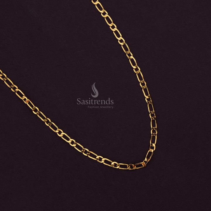 - Description: Upgrade your jewellery collection with this Micro Gold Plated Figaro Link Chain, crafted using 24-carat pure gold plating to achieve a look like real gold finish. This chain features a classic Figaro link structure, characterized by alternating elongated and circular links, giving it a sleek and contemporary appeal. The structured yet flexible design makes it a perfect choice for pairing with pendants or wearing as a standalone accessory. Secured with a sturdy lobster clasp, this chain ensures a secure and comfortable fit, making it ideal for festive, temple, and saree wear. Guaranteed to add an elegant touch to your traditional jewellery collection.