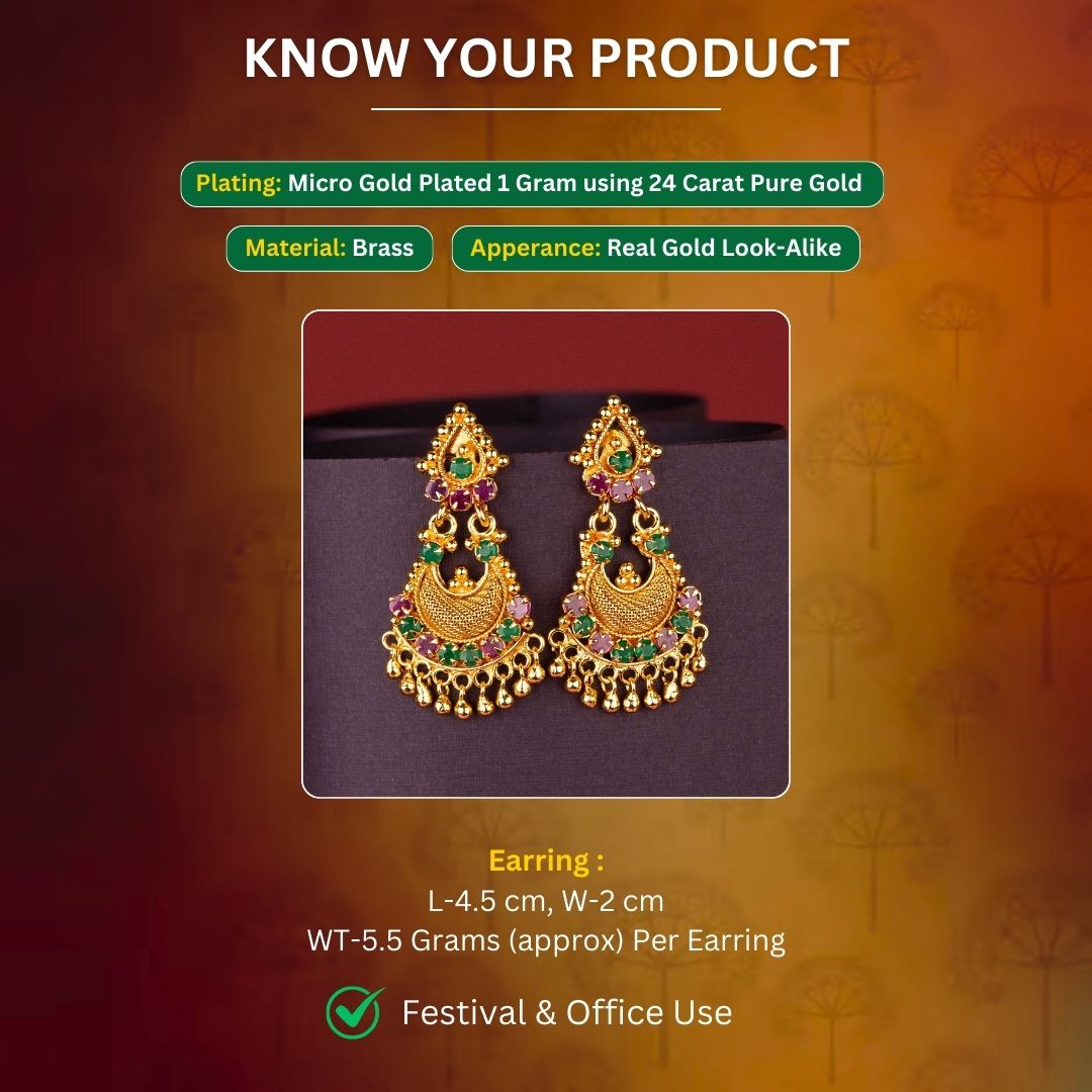 - Description: Discover the elegance of traditional craftsmanship with these stunning crescent moon-shaped AD stone earrings, beautifully designed to add a touch of sophistication to any attire. Plated with 24 carat pure gold, these earrings are a perfect blend of cultural richness and modern aesthetics. The intricate design features a crescent moon motif adorned with round AD stones, creating a captivating sparkle that enhances your overall look. Ideal for weddings, engagements, and special traditional occasions, these earrings come in four exquisite color combinations: Ruby, Ruby-White, Ruby-Green, and Multi.