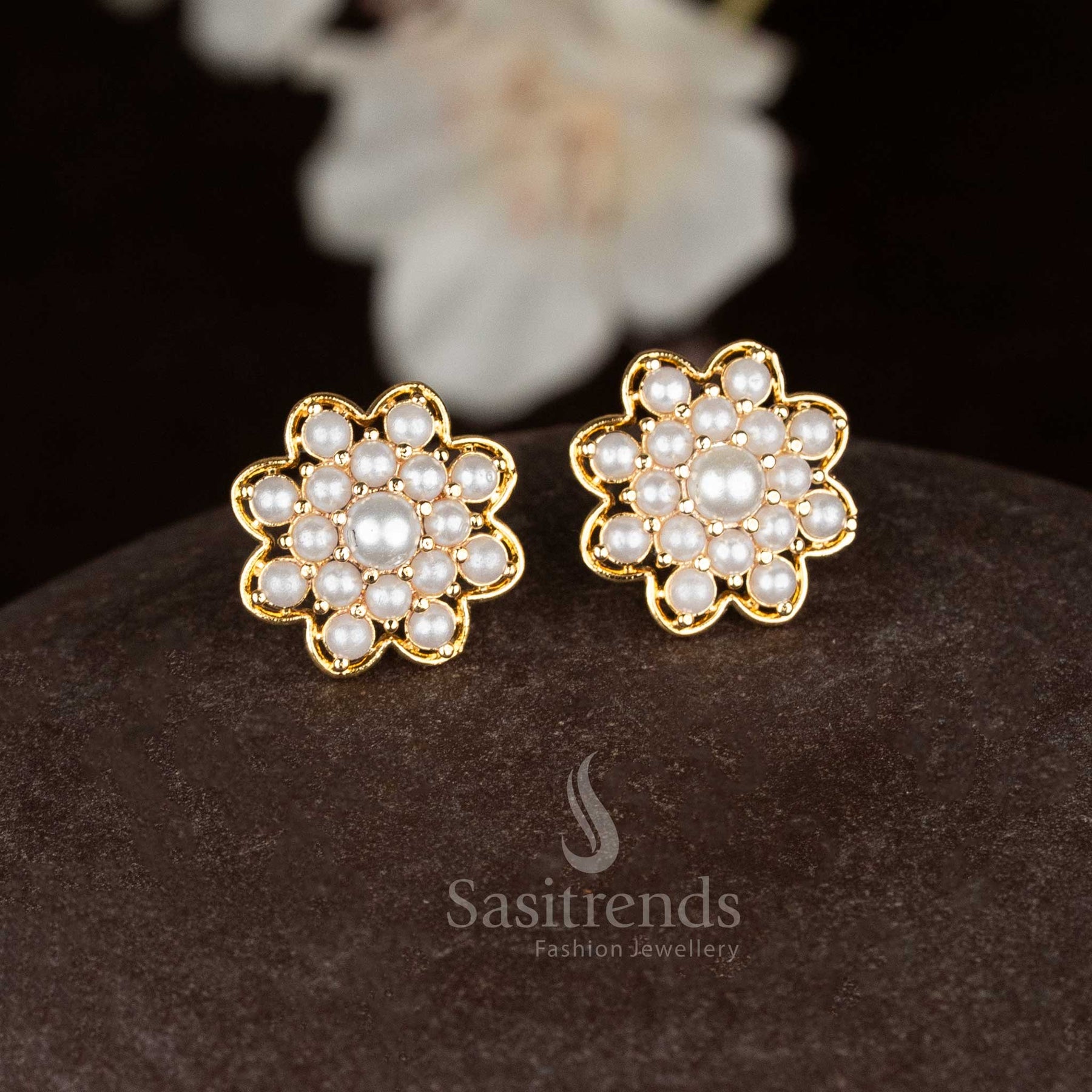 Twinkling micro gold floral earrings with pearl adornments perfect for wedding and ethnic occasions - Sasitrends