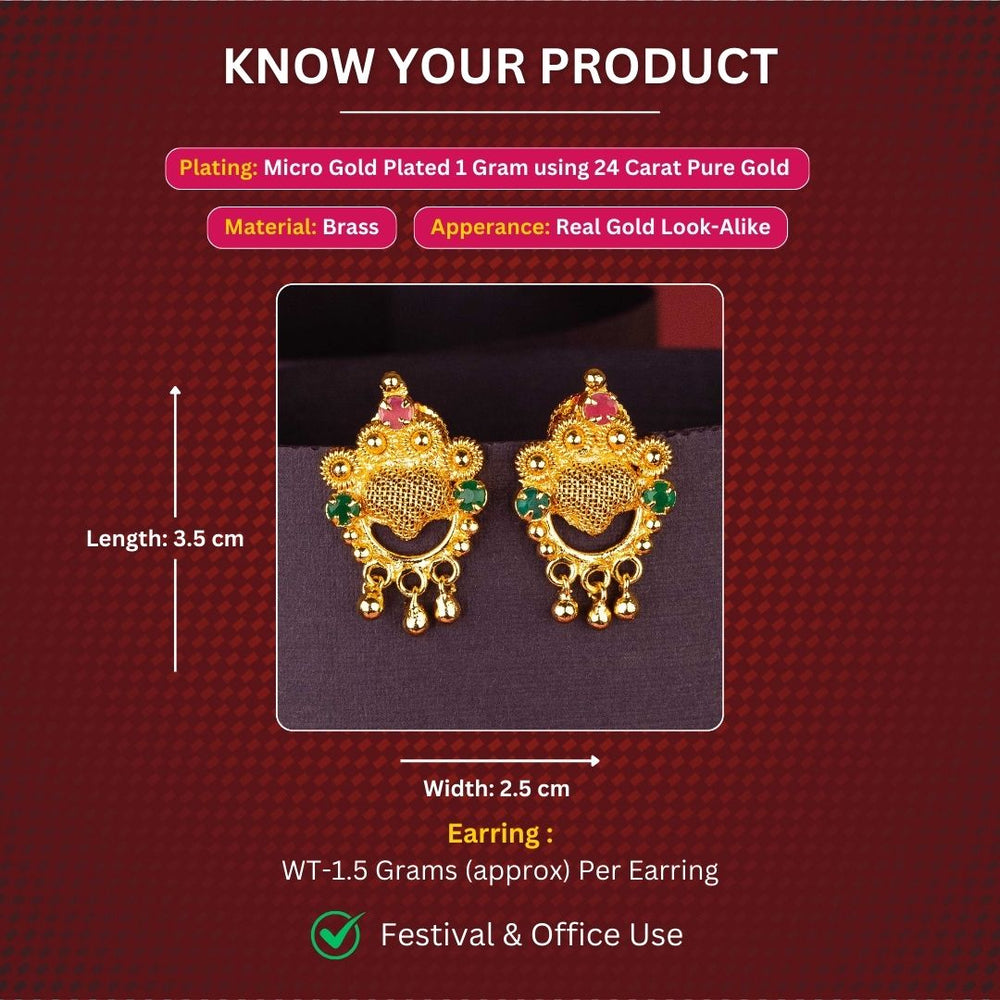 - Description: These stunning earrings feature an intricate mesh design, adorned with multiple AD stones in various colors and finished with golden balls. The earrings showcase a unique pattern with a blend of traditional and modern elements. Ideal for both everyday wear and special occasions, these earrings offer the elegance of real gold. They come in five beautiful color variations: White, Ruby, Ruby-Green, White-Ruby, and Multi. Crafted with guaranteed one-gram micro gold plated using 24-carat pure gold, these earrings are a timeless addition to any jewellery collection.
