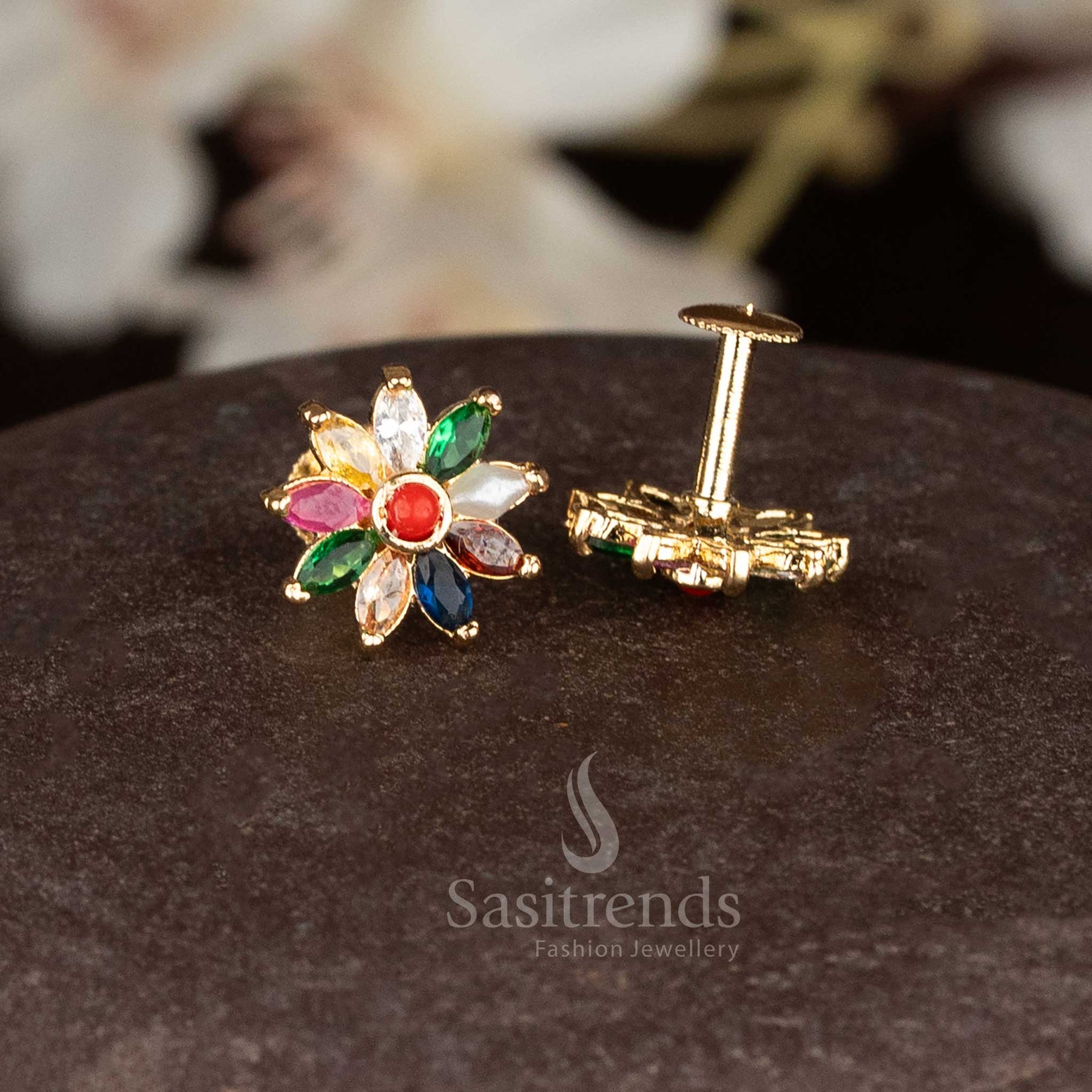 Description: Elevate your ethnic ensemble with these Regal Guaranteed Micro Gold Plated Pearl, Pavalam, and Navarathnam Daisy Flower Screw Stud Earrings, designed for women who love luxurious yet versatile accessories. The daisy floral motif is adorned with shimmering pearls, rich pavalam, and colorful navarathnam stones, reflecting a radiant, gold-like finish that stands out on any occasion. Crafted with Guaranteed Micro Gold Plating, these earrings offer lasting brilliance, durability, and premium quality. The secure screw-type backing ensures a comfortable fit for festivals, temple visits, cultural events, family gatherings, and casual traditional wear, making them perfect for both daily and special occasions. Each stud highlights intricate floral craftsmanship, blending traditional artistry with modern elegance. Lightweight yet opulent, they are ideal for women who seek high-quality, sophisticated, and eye-catching accessories. Their vibrant daisy design adds a lively and graceful touch to sarees, silk outfits, or designer ethnic ensembles. Whether attending a temple function, a festive celebration, or a cultural gathering, these earrings bring a luxurious sparkle, refined charm, and timeless appeal. A perfect addition to your jewellery collection, these floral studs effortlessly combine tradition, style, and premium elegance.