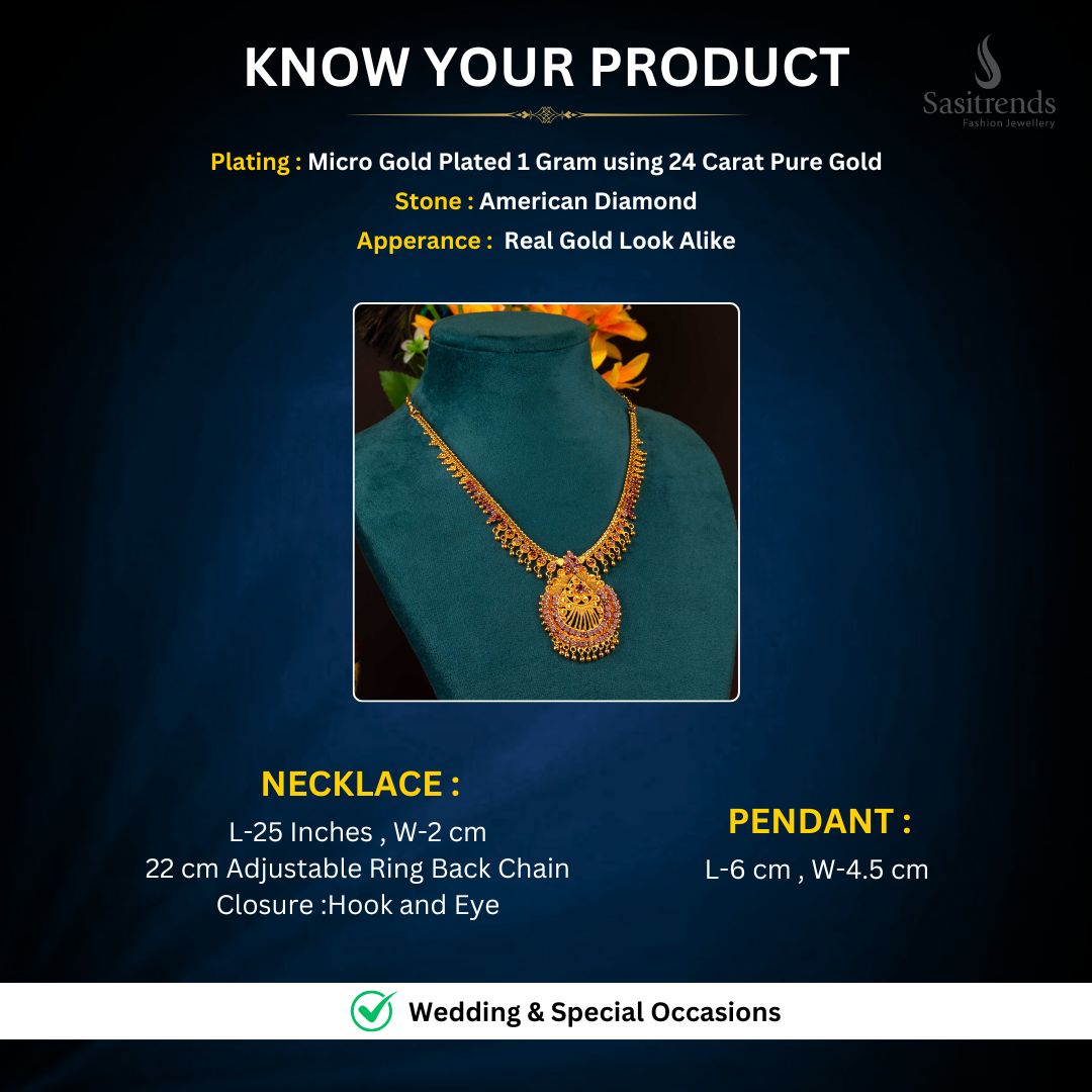 - Product Description: The necklace in the third image is an exquisite example of traditional Jewellery craftsmanship. This stunning piece features a gold-toned chain adorned with a series of intricate decorative elements, creating a luxurious and elegant appearance. The centerpiece of the necklace is a large, ornate pendant with an inverted teardrop shape and a detailed layered design. The pendant's outer edge is lined with small pink stones, adding a vibrant touch, while the interior showcases a filigree design with gold-toned patterns and small beads, creating a rich, textured look. Clusters of AD stones arranged in a floral pattern enhance the opulent appearance of the pendant. The necklace is further embellished with small ornamental drops along the chain, featuring intricate gold work and pink stones that match the pendant's design. Composed of finely crafted gold links, the chain provides both flexibility and durability, with a polished finish that enhances its reflective quality. Equipped with a secure clasp, this necklace ensures it stays in place while being worn. Perfect for special occasions such as weddings, festivals, or formal events, this micro gold-plated one gram guaranteed necklace combines intricate gold work and vibrant pink stones to create a rich, opulent appearance sure to make a statement. Plated with 24-carat pure gold, it looks like real gold and comes with a one-year guarantee.