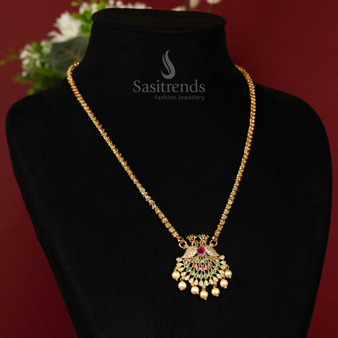 - Product Description: Upgrade your traditional elegance with this exquisite Micro Gold Plated Dasavathram Chain Necklace featuring a beautifully crafted peacock pendant. This necklace is perfect for significant celebrations such as weddings, festive occasions, and traditional events. The intricate design blends ethnic charm with modern aesthetics, making it a versatile addition to any jewellery collection. Crafted from high-quality brass and plated with one gram micro gold using 24 carat pure gold, this necklace ensures durability and a luxurious finish. The pendant is adorned with high-quality multi-color stones, American diamonds (ZX stones), and lustrous pearls, adding a brilliant sparkle and sophistication to your ensemble. This necklace is an excellent gift for mothers, daughters, grandmothers, sisters, wives, and mothers-in-law.