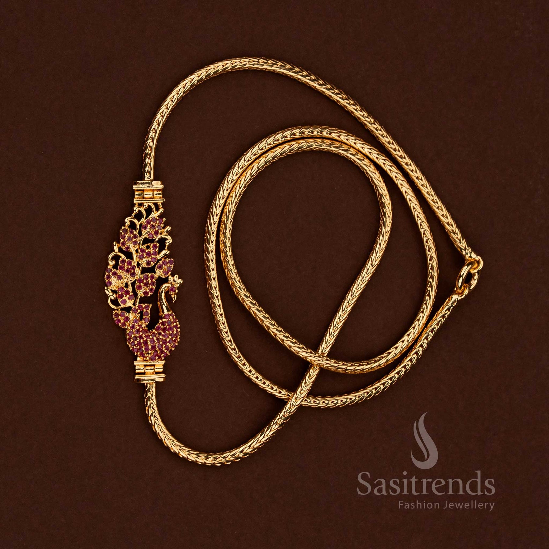 - Description: This intricately designed mugappu chain features a unique peacock motif embellished with multi-color American Diamond (AD) stones. The peacock's tail is artistically detailed with vibrant red, green, and white AD stones, creating a floral pattern that complements the overall design. The mugappu is connected to a flexible thali kodi chain, gold-plated with one-gram micro gold plating, offering a perfect combination of tradition and elegance. This 24-inch guaranteed chain is ideal for pairing with sarees and silk sarees, making it a perfect match for your gold jewellery collection. It’s the best gift for a mother, mother-in-law, wife, or any woman who loves traditional jewellery styles