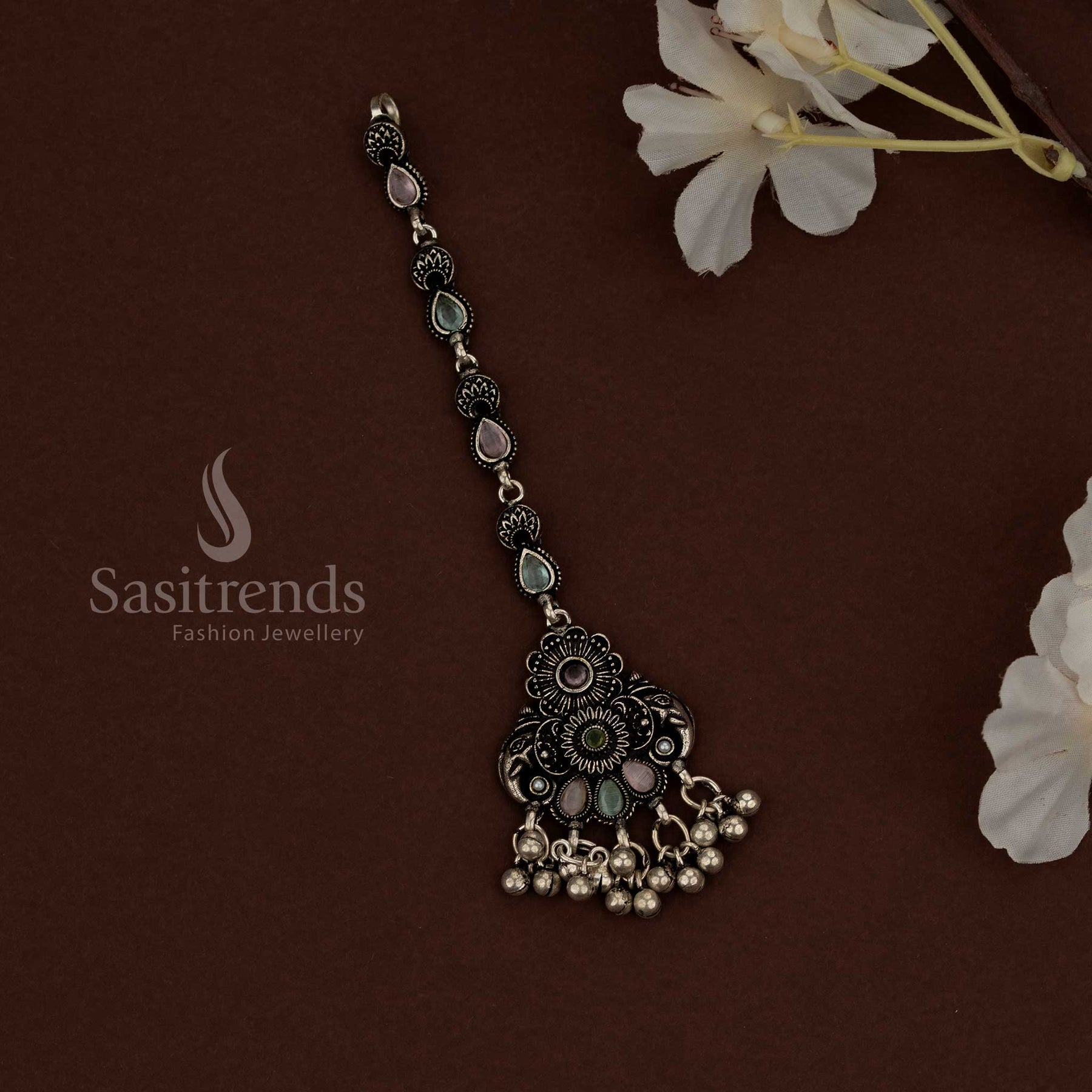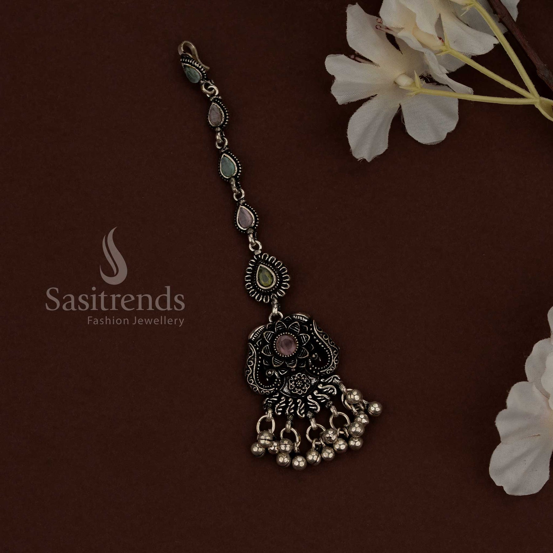 - Care: Store the maang tikka in a dry, separate jewellery box when not in use. Avoid water, perfumes, and chemicals. Wipe gently with a soft, dry cloth after use to preserve the oxidised finish.