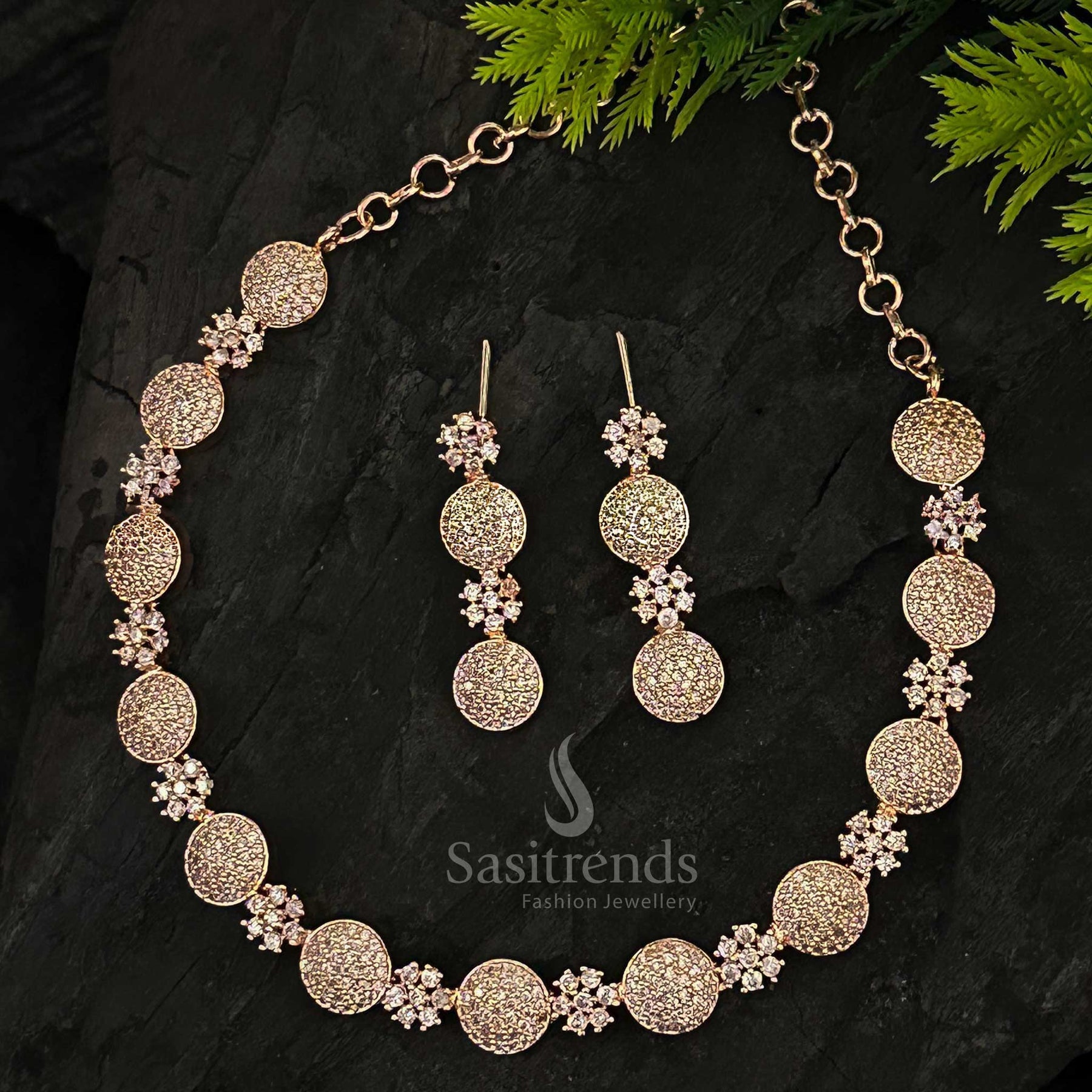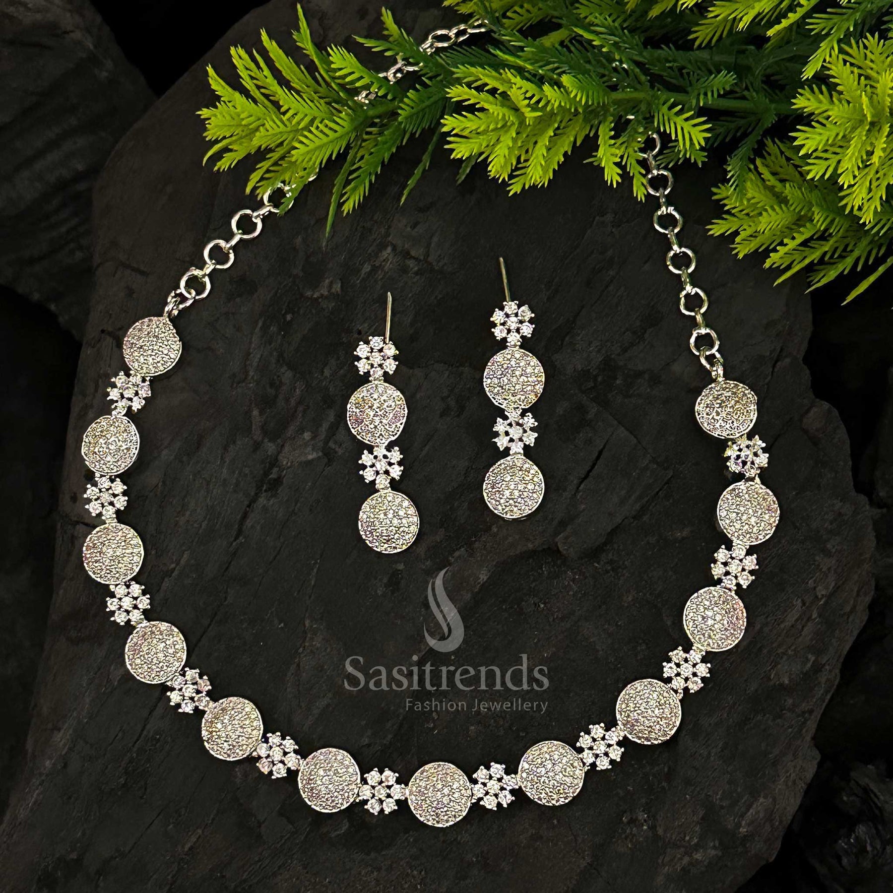 - Description: Elevate your style with this exquisite party wear American Diamond Necklace jewellery set, featuring a stunning necklace adorned with a floral pattern interspersed with alternating round motifs, all studded with sparkling American Diamonds that shimmer beautifully with every movement. Crafted from high-quality brass and plated in rich Rhodium Silver and Rose Gold, this set exudes a luxurious and elegant look that enhances any outfit. The adjustable chain ensures a perfect fit, while the matching earrings complete the ensemble with graceful sophistication. Perfect for parties, engagements, receptions, functions, and festive celebrations, this jewellery set pairs effortlessly with both ethnic and western attire, adding instant glamour and allure. This versatile set also makes a thoughtful and cherished gift for women and girls, symbolizing elegance, style, and timeless sparkle. Make every occasion special with this dazzling jewellery set that promises to leave a lasting impression. Designed for those who love to make a statement, this jewellery set combines traditional charm with modern elegance. The intricate detailing and dual plating of Rhodium Silver and Rose Gold ensure a versatile style that complements both vibrant ethnic ensembles and chic contemporary outfits. Its timeless design allows you to treasure it for years, making it not just an accessory but a lasting piece of elegance in your jewellery collection.