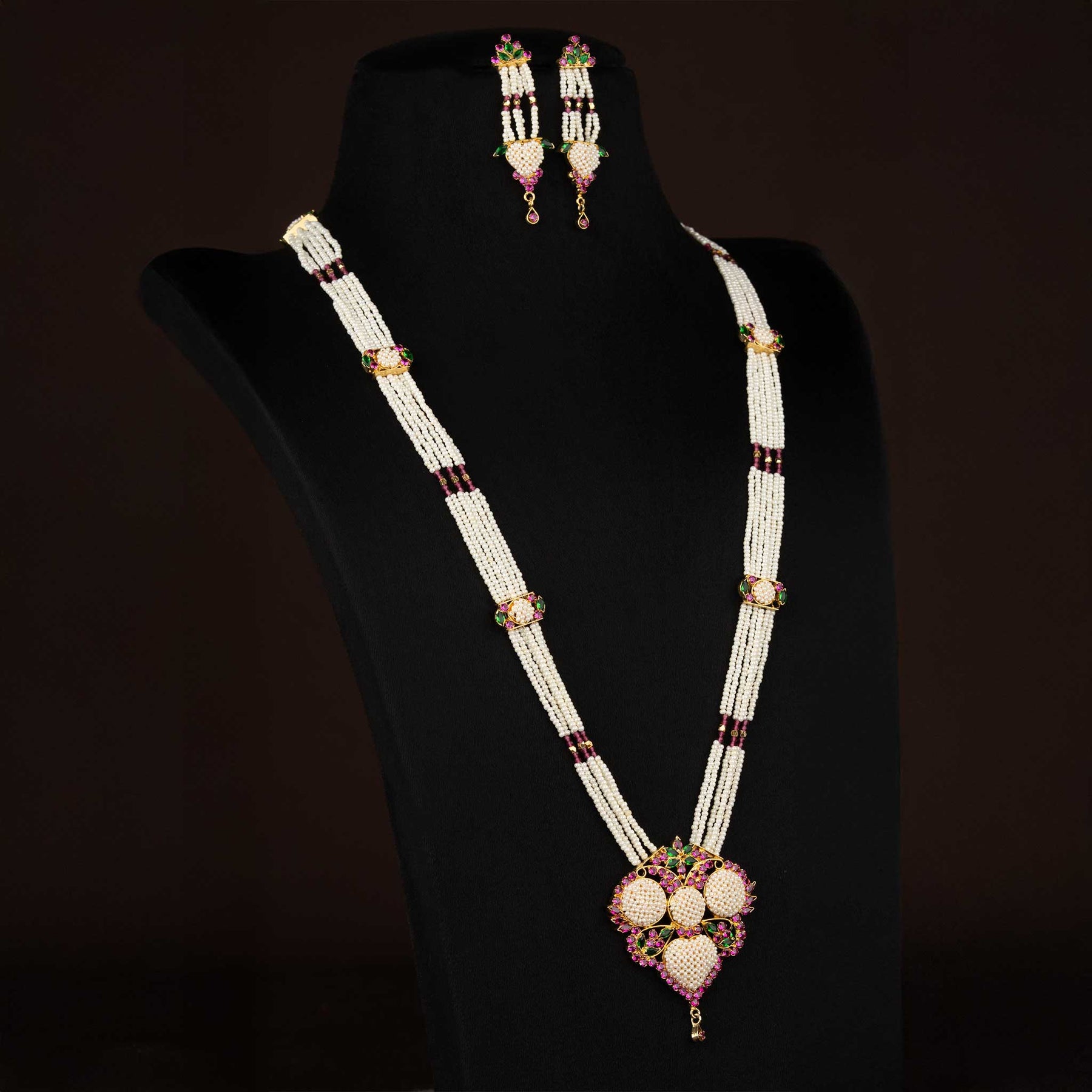 Description: Amazing reflects artistic elegance inspired by butterfly wings blended with refined American Diamond brilliance. This American Diamond micro gold plated long necklace set features delicately shaped butterfly wing motifs accented with circular pearl highlights, creating a flowing and graceful visual rhythm. The elongated design adds vertical elegance, making the necklace a standout piece for layered and statement stylingThe butterfly wing elements symbolise lightness and beauty, while the circular pearl accents introduce softness and balance to the design. Carefully arranged American Diamond stones enhance sparkle without overpowering the overall form. The micro gold plated finish adds warmth and polish, making the necklace suitable for refined contemporary looks. Coordinated earrings reflect the butterfly and pearl detailing, completing the set with cohesive charm.Ideal for fashion showcases, celebratory lunches, cultural evenings, festive outings, themed gatherings, and elegant day-to-evening transitions, this long necklace pairs beautifully with flowy sarees, Indo-western dresses, long kurtas, and minimalist gowns. Designed for those who enjoy expressive designs with American Diamond shine, this necklace set offers graceful movement, visual interest, and modern sophistication.