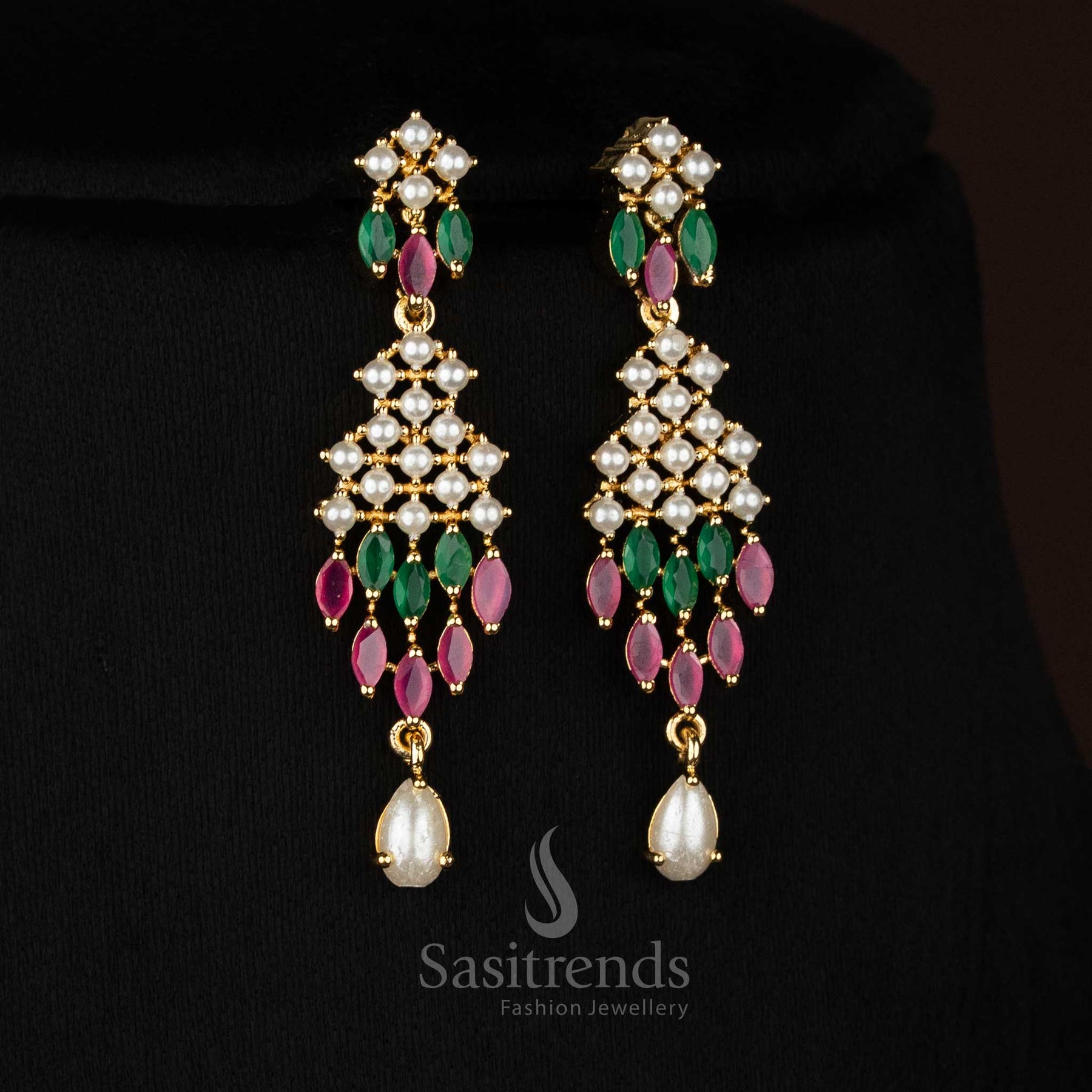 Fascinating Micro Gold Plated American Diamond Criss-Cross Necklace Jewellery Set with Teardrop Pearl Drops | Party wear Jewellery
