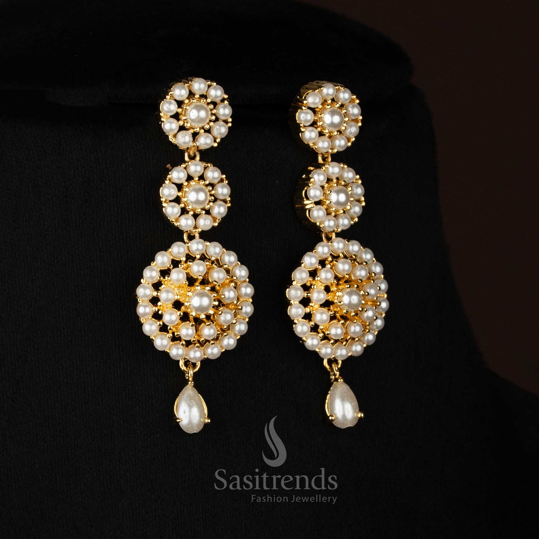 Attractive American Diamond Micro Gold Plated Circular Floral Pearl & Teardrop Long Necklace Set for Party Styling & Evening Outings